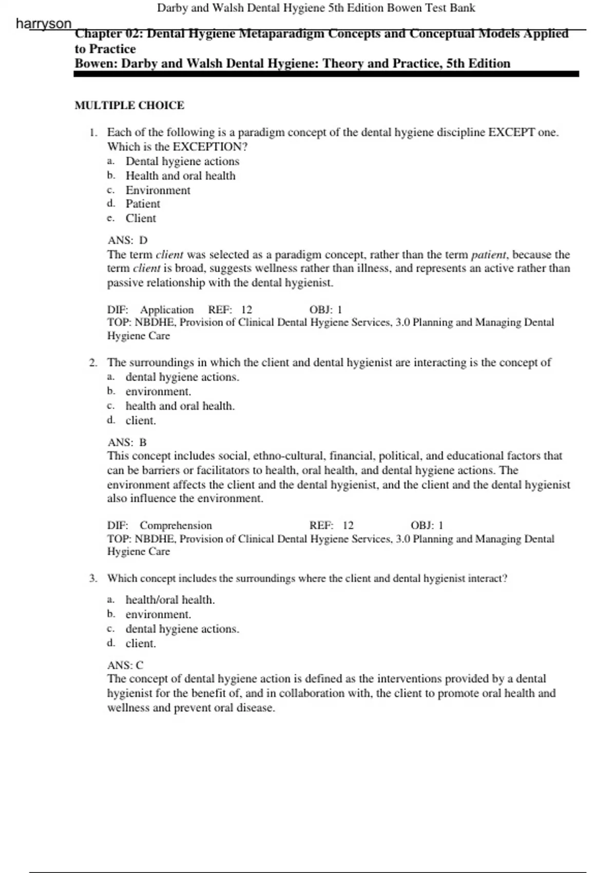 Test Bank For Darby and Walsh Dental Hygiene 5th Edition By Jennifer A Pieren; Denise M. Bowen 9780323477192 Chapter 1-64 Complete Guide .MULTIPLE CHOICE 1. Each of the following is a paradigm concept of the dental hygiene discipline EXCEPT one. Which is the EXCEPTION? a. Dental hygiene actions b. Health and oral health c. Environment d. Patient e. Client ANS: D The term client was selected as a paradigm concept, rather than the term patient, because the term client is broad, suggests wellness rather than illness, and represents an active rather than passive relationship with the dental hygienist. DIF: Application REF: 12 OBJ: 1 TOP: NBDHE, Provision of Clinical Dental Hygiene Services, 3.0 Planning and Managing Dental Hygiene Care 2. The surroundings in which the client and dental hygienist are interacting is the concept of a. dental hygiene actions. b. environment. c. health and oral health. d. client. ANS: B This concept includes social, ethno-cultural, financial, political, and educational factors that can be barriers or facilitators to health, oral health, and dental hygiene actions. The environment affects the client and the dental hygienist, and the client and the dental hygienist also influence the environment. DIF: Comprehension REF: 12 OBJ: 1 TOP: NBDHE, Provision of Clinical Dental Hygiene Services, 3.0 Planning and Managing Dental Hygiene Care 3. Which concept includes the surroundings where the client and dental hygienist interact? a. health/oral health. b. environment. c. dental hygiene actions. d. client. ANS: C The concept of dental hygiene action is defined as the interventions provided by a dental hygienist for the benefit of, and in collaboration with, the client to promote oral health and wellness and prevent oral disease. harryson Darby and Walsh Dental Hygiene 5th Edition Bowen Test Bank DIF: Comprehension REF: 13 OBJ: 1 TOP: NBDHE, Provision of Clinical Dental Hygiene Services, 3.0 Planning and Managing Dental Hygiene Care 4. “Biologically sound and functional dentition” is a feature of the a. Dental Hygiene Human Needs Conceptual Model. b. Oral Health-Related Quality of Life Model. c. Client Self-Care Commitment Model. d. paradigm concept of the dental hygiene discipline. ANS: A It is one of the eight human needs related to dental hygiene care in the Dental Hygiene Human Needs Conceptual Model. It draws upon the four dental hygiene disciplinary concepts to develop an understanding of client human needs throughout the dental hygiene process of care. DIF: Comprehension REF: 19 OBJ: 2 TOP: NBDHE, Provision of Clinical Dental Hygiene Services, 3.0 Planning and Managing Dental Hygiene Care 5. Which clinical dental hygiene conceptual practice model emphasizes the client’s perceptions of and reactions to their own health status? a. Paradigm concept of the dental hygiene discipline b. Oral Health-Related Quality of Life Model c. Dental Hygiene Human Needs Conceptual Model d. Client Self-Care Commitment Model ANS: B The Oral Health-Related Quality of Life Model was developed by dental hygiene educator-researchers at the University of Missouri-Kansas City. It specifically assesses the domains of symptom status, functional status, and oral health perceptions. DIF: Recall REF: 20 OBJ: 2 TOP: NBDHE, Provision of Clinical Dental Hygiene Services, 3.0 Planning and Managing Dental Hygiene Care 6. The model that involves clients as co-therapists in their own oral health decisions is the a. Dental Hygiene Human Needs Conceptual Model. b. Oral Health-Related Quality of Life Model. c. Client Self-Care Commitment Model. d. paradigm concept of the dental hygiene discipline. ANS: C The model is based on the premise that effectively involving clients as co-therapists in their oral health decisions, enhances motivation, commitment, and compliance with oral self-care. DIF: Comprehension REF: 23 OBJ: 2 TOP: NBDHE, Provision of Clinical Dental Hygiene Services, 3.0 Planning and Managing Dental Hygiene Care 7. In the Dental Hygiene Human Needs Conceptual Model, the client is viewed as having how many human needs especially related to dental hygiene care?