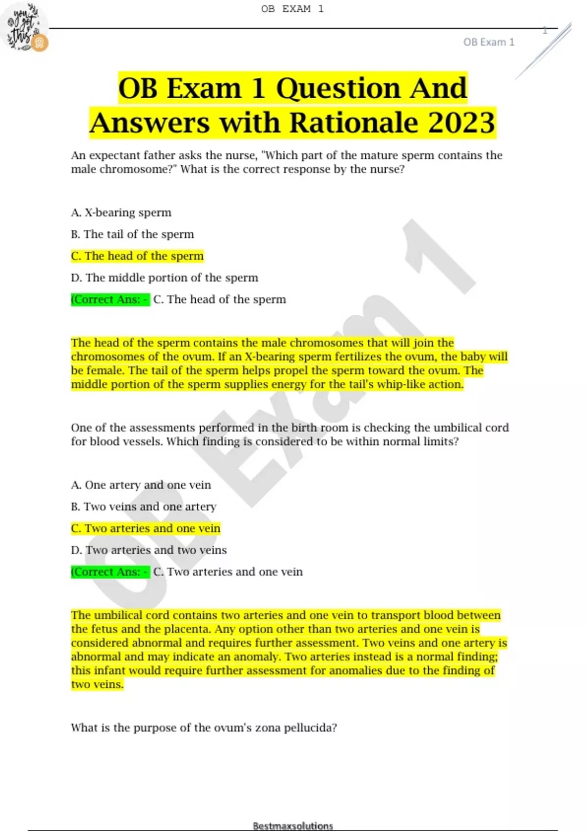 OB Exam 1 Question And Answers with Rationale 2023