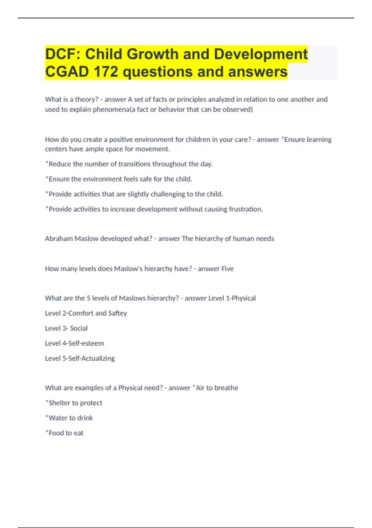 What is a theory? A set of facts or principles analyzed in relation to one another and used to explain phenomena(a fact or behavior that can be observed) How do you create a positive environment for children in your care? *Ensure learning centers have ample space for movement. *Reduce the number of transitions throughout the day. *Ensure the environment feels safe for the child. *Provide activities that are slightly challenging to the child. *Provide activities to increase development without causing frustration. Abraham Maslow developed what? The hierarchy of human needs How many levels does Maslow's hierarchy have? Five What are the 5 levels of Maslows hierarchy? Level 1-Physical Level 2-Comfort and Saftey Level 3- Social Level 4-Self-esteem Level 5-Self-Actualizing What are examples of a Physical need? *Air to breathe *Shelter to protect *Water to drink *Food to eat *Clothes to wear *Health care What are examples of Comfort and Saftey? *Safety *Security *Stability *Transportation *Safe relationships *Child care What are some examples of Self-Esteem? *Adequacy *Confidence *Importance *Sense of efficiency,capability,resilency,hopefulness *Ability to cope and problem solve What are some examples of Self-Actualizing? *Fulfill one's life purpose and meaning *Being all that one is able to be *Spirituality *Personal emotional response *Refinement of interpersonal skills What does the heirarchy of needs mean to you as a child care professional? *Basic needs must be met first,when not met,the child's self worth suffers. *Neglect can occur at all levels,not just basic needs.All needs are important. *Child care professionals need to be aware of the family circumstances to understand what needs are beig met at home. What are some hints that will help you remember Maslows's theory? *If you close the "M" at the bottom, it will form triangles or pyramids. *Maslow studies human needs. *What motivates children to act the way they do? Needs being met. Do the lower levels of needs have to be met before higher needs can be accomplished? Yes Successfully meeting the needs at each level results in what? Fulfilling one's life with purpose and meaning. Erik Erikson developed what? He developed eight pyschosocial stages through which humans develop throughout their entire lifetime. It is called the Eight Conflicts in Emotional Development. How is Erik Erikson recognized? As a development pyschologist who can be compared to Sigmund Freud because of his theory that humans develop in stages. What are each of Erikson's stages called? Conflicts Moving successfully through each of Erikson's stages results in what? A strong social and emotional life. What is the first conflict in Erikson's theory and the age that it is presented at? Trust vs. Mistrust (Birth to 1 year) What is the second conflict in Erikson's theory and the age that it is presented? Autonomy vs. Shame and Doubt (1 to 3 years) What is the third conflict in Erikson's theory and the age that it is presented? Initiative vs. Guilt (4 to 5 years) What is the fourth conflict in Erikson's theory and the age that it is presented? Industry vs. Inferiority (6 to 12 years) Why don't we study Erikson's Conflicts 5-8? They are important in the study of human development,but they are less significant in child development,because Erikson believes that they occur after the age of 12. What is the meaning of Trust vs. Conflict *Trust is developed over time by providing an infant with a consistent,comforting environment. *When needs are met,trust is established. *Trust builds a emotional foundation. *A lack of trust can result in proor emotional stability. What is the meaning of Autonomy vs. Shame and Doubt? *Toddlers need to explore their own bodies and environment in order to become confident about themselves. *When autonomy is allowed a person can become comfortable with his/her choices. *A lack of autonomy can result in a feeling of shame or insecurity. What is the meaning of Initiative vs. Guilt? *When initiative is encourged,a person experiments within one's environment. *4 or 5 year olds begin to develop an interest in exploring beyond themselves. *Children who can't explore will be prone to guilt for their actions. *A lack of industry can result in a feeling of low self worth. What does Erikson's theory mean to a child care professional? It means they can: *Create relationships with children based on trust. *Allow children to exercise autonomy whenever safe and practical. *Guide children to initiate activity or portions of activities whenever safe and practical. *Promote the building of your children's creativity during activities.