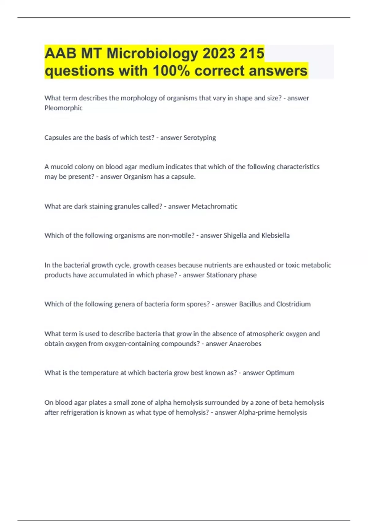 AAB MT Microbiology 2023 |215 questions with 100% correct answers