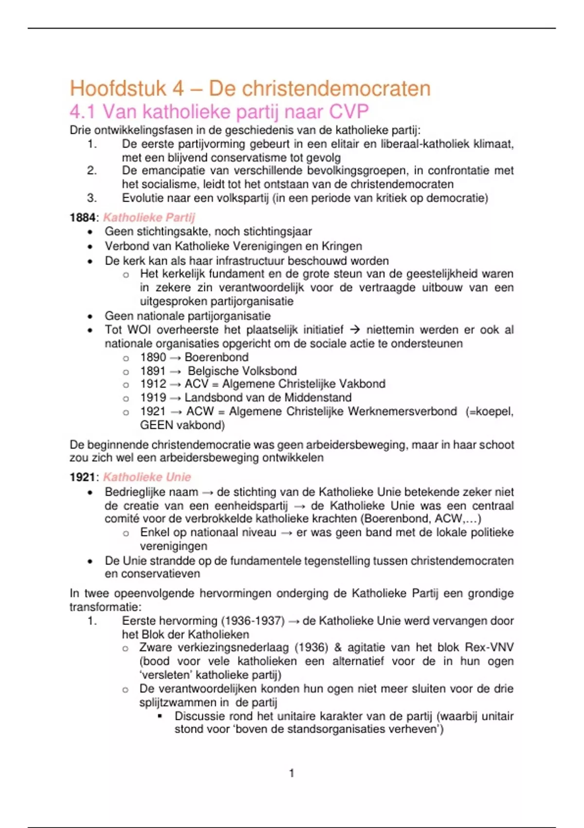 Samenvatting van het hoofdstuk 'christendemocraten' van het vak Belgische Binnenlandse Politiek