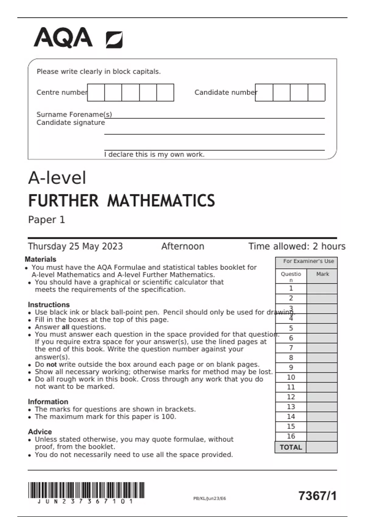 FURTHER MATHEMATICS Paper 1 Thursday 25 May 2023 Afternoon Time allowed: 2 hours Materials You must have the AQA Formulae and statistical tables booklet for A‑level Mathematics and A‑level Further Mathematics. You should have a graphical or scientific calculator that meets the requirements of the specification. Instructions Use black ink or black ball‑point pen. Pencil should only be used for drawing. Fill in the boxes at the top of this page. Answer all questions. You must answer each question in the space provided for that question. If you require extra space for your answer(s), use the lined pages at the end of this book. Write the question number against your answer(s). Do not write outside the box around each page or on blank pages. Show all necessary working; otherwise marks for method may be lost. Do all rough work in this book. Cross through any work that you do not want to be marked. Information The marks for questions are shown in brackets. The maximum mark for this paper is 100. Advice Unless stated otherwise, you may quote formulae, without proof, from the booklet. You do not necessarily need to use all the space provided. PB/KL/Jun23/E6 7367/1 Answer all questions in the spaces provided. 1 Find the number of solutions of the equation tanh x ¼ cosh x Circle your answer. [1 mark] outside the box 0 1 2 3 2 The diagram below shows a locus on an Argand diagram. Im O 2 Re – 3 Which of the equations below represents the locus shown above? Circle your answer. [1 mark] jz — 2 þ 3ij¼ 2 jz þ 2 — 3ij¼ 2 jz — 2 þ 3ij¼ 4 jz þ 2 — 3ij¼ 4 1 2 3 The matrix A ¼ 0 1 represents a transformation. outside the box Which one of the points below is an invariant point under this transformation? Circle your answer. [1 mark] (1, 1) (0, 2) (3, 0) (2, 1) 4 The solution of a second order differential equation is f (t) The differential equation models heavy damping. Which one of the statements below could be true? Tick (3) one box. [1 mark] f (t) ¼ 2e—t cos (3t) þ 5e—t sin (3t) f (t) ¼ 3e—t þ 4te—t f (t) ¼ 7e—t þ 2e—2t f (t) ¼ 8e—t cos (3t — 0:1) Turn over for the next question Turn over 5 The function f is defined by f (r) ¼ 2r(r — 2) (r 2 Z) box 5 (a) Show that f (r þ 1) — f (r) ¼ r2 r [2 marks] 5 (b) Use the method of differences to show that box n r2 r ¼ 2nþ1(n — 1) þ 2 r¼1 [4 marks] Turn over for the next question Turn over 6 The matrix M is given by 2 a a —6 3 box M ¼ 6 0 10 0 7 where a is a real number. 10 4 9 14 —13 5 The vectors v1, v2, and v3 are eigenvectors of M The corresponding eigenvalues are l1, l2, and l3 respectively. 2 1 3 2 1 3 2 c 3 It is given that l2 ¼ 1 and v1 ¼ 6 0 7 , v2 ¼ 6 1 7 and v3 ¼ 64 0 75 , 6 (a) (i) Find the value of l1 [2 marks] 6 (a) (ii) Find the value of a [2 marks] 6 (b) Find the integer c and the value of l3 [4 marks] box 6 (c) Find matrices U, D and U—1, such that D is diagonal and M ¼ UDU—1 [3 marks] Turn over (07) 7 The function f is defined by f (x) ¼ .sin x þ . (0 ≤ x ≤ 2r) box Find the set of values of x 2. f (x) 1 2 Give your answer in set notation. [5 marks] (0 )