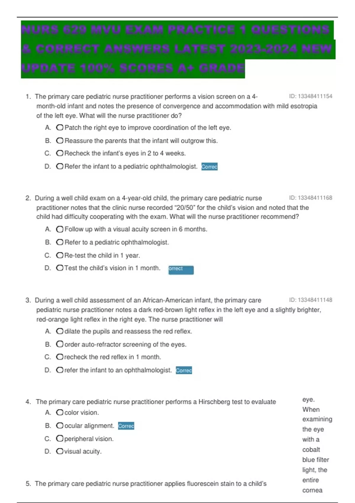 NURS 629 MVU EXAM PRACTICE 1 QUESTIONS & CORRECT ANSWERS LATEST NEW UPDATE 100% SCORES A+ GRADE 1. The primary care pediatric nurse practitioner performs a vision screen on a 4- ID: month-old infant and notes the presence of convergence and accommodation with mild esotropia of the left eye. What will the nurse practitioner do? A. Patch the right eye to improve coordination of the left eye. B. Reassure the parents that the infant will outgrow this. C. Recheck the infant’s eyes in 2 to 4 weeks. D. Refer the infant to a pediatric ophthalmologist. Correct 2. During a well child exam on a 4-year-old child, the primary care pediatric nurse ID: practitioner notes that the clinic nurse recorded “20/50” for the child’s vision and noted that the child had difficulty cooperating with the exam. What will the nurse practitioner recommend? A. Follow up with a visual acuity screen in 6 months. B. Refer to a pediatric ophthalmologist. C. Re-test the child in 1 year. D. Test the child’s vision in 1 month. 3. During a well child assessment of an African-American infant, the primary care ID: pediatric nurse practitioner notes a dark red-brown light reflex in the left eye and a slightly brighter, red-orange light reflex in the right eye. The nurse practitioner will A. dilate the pupils and reassess the red reflex. B. order auto-refractor screening of the eyes. C. recheck the red reflex in 1 month. D. refer the infant to an ophthalmologist. Correct 4. The primary care pediatric nurse practitioner performs a Hirschberg test to evaluate A. color vision. B. ocular alignment. Correct C. peripheral vision. D. visual acuity. 5. The primary care pediatric nurse practitioner applies fluorescein stain to a child’s eye. When examining the eye with a cobalt blue filter light, the entire cornea appears cloudy. What does this indicate? A. The cornea has not been damaged. ID: ID: B. There is too little stain on the cornea. C. There is damage to the cornea. D. There is too much stain on the cornea. Correct 6. A toddler exhibits exotropia of the right eye during a cover-uncover screen. The ID: primary care pediatric nurse practitioner will refer to a pediatric ophthalmologist to initiate which treatment? A. Botulinum toxin injection B. Corrective lenses C. Occluding the affected eye for 6 hours per day D. Patching of the unaffected eye for 2 hours each day 7. The primary care pediatric nurse practitioner performs a well child examination on ID: a 9-month-old infant who has a history of prematurity at 28 weeks’ gestation. The infant was treated for retinopathy of prematurity (ROP) and all symptoms have resolved. When will the infant need an ophthalmologic exam? A. At 12 months of age Correct B. At 24 months of age C. At 48 months of age D. At 60 months of age 8. During a well-baby assessment on a 1-week-old infant who had a normal exam ID: when discharged from the newborn nursery 2 days prior, the primary care pediatric nurse practitioner notes moderate eyelid swelling, bulbar conjunctival injections, and moderate amounts of thick, purulent discharge. What is the likely diagnosis? A. Chemical-induced conjunctivitis