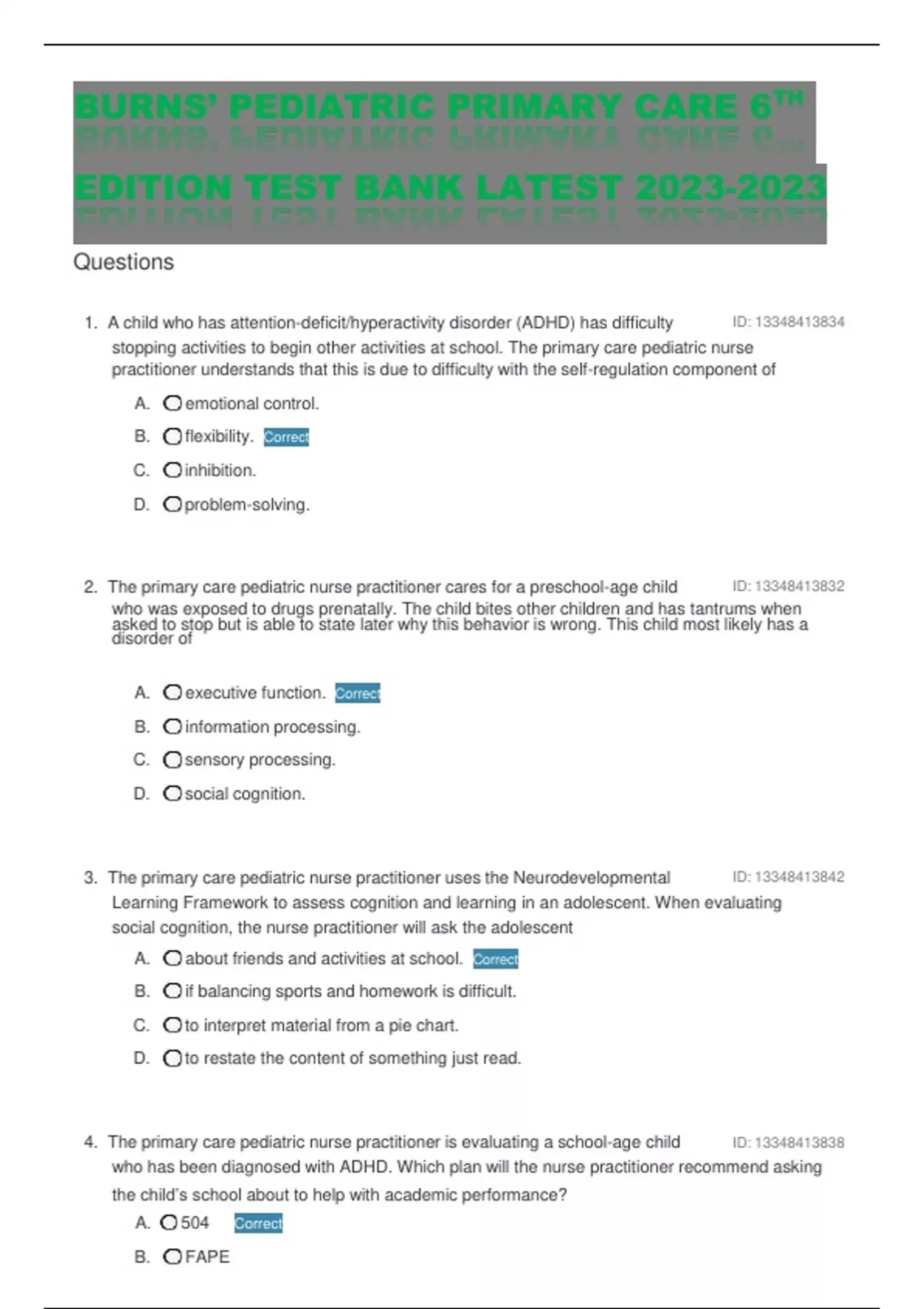 BURNS’ PEDIATRIC PRIMARY CARE 6TH EDITION TEST BANK LATEST Questions 1. A child who has attentiondeficit/hyperactivity disorder (ADHD) has difficulty ID: stopping activities to begin other activities at school. The primary care pediatric nurse practitioner understands that this is due to difficulty with the selfregulation component of A. emotional control. B. flexibility. Correct C. inhibition. D. problemsolving. 2. The primary care pediatric nurse practitioner cares for a preschoolage child ID: who was exposed to drugs prenatally. The child bites other children and has tantrums when asked to stop but is able to state later why this behavior is wrong. This child most likely has a disorder of A. executive function. Correct B. information processing. C. sensory processing. D. social cognition. 3. The primary care pediatric nurse practitioner uses the Neurodevelopmental ID: Learning Framework to assess cognition and learning in an adolescent. When evaluating social cognition, the nurse practitioner will ask the adolescent A. about friends and activities at school. Correct B. if balancing sports and homework is difficult. C. to interpret material from a pie chart. D. to restate the content of something just read. 4. The primary care pediatric nurse practitioner is evaluating a schoolage child ID: who has been diagnosed with ADHD. Which plan will the nurse practitioner recommend asking the child’s school about to help with academic performance? A. 504 Correct B. FAPE C. IDEA D. IEP 5. The parent of a child diagnosed with ADHD tells the primary care pediatric ID: nurse practitioner that the child gets overwhelmed by homework assignments, doesn’t seem to know which ones to do first, and then doesn’t do any assignments. The nurse practitioner tells the parent that this represents impairment in which executive function? A. Activation Correct B. Effort C. Emotion D. Focus 6. The primary care pediatric nurse practitioner is considering medication ID: options for a schoolage child recently diagnosed with ADHD who has a primarily hyperactive presentation. Which medication will the nurse practitioner select initially? A. Lowdose stimulant B. Moderatedose stimulant Correct C. Lowdose nonstimulant D. Moderatedose nonstimulant 7. The parent of a 4yearold child reports that the child gets upset when the ID: hall light is left on at night and won’t leave the house unless both shoes are tied equally tight. The primary care pediatric nurse practitioner recognizes that this child likely has which type of sensory processing disorder? A. Dyspraxia B. Overresponder Correct C. Sensory seeker D. Underresponder 8. The parent of a preschoolage child who is diagnosed with a sensory ID: processing disorder (SPD) asks the primary care pediatric nurse practitioner how to help the child manage the symptoms. What will the nurse practitioner recommend? A. Establishing a reward system for acceptable behaviors B. Introducing the child to a variety of new experiences C. Maintaining predictable routines as much as possible Correct D. Providing frequent contact, such as hugs and cuddling 9. The primary care pediatric nurse practitioner is performing an examination on ID: a 5yearold child who exhibits ritualistic behaviors, avoids contact with other children, and has limited speech. The parent reports having had concerns more than 2 years ago about autism, but was told that it was too early to diagnose. What will the nurse practitioner do first? A. Administer an MCHAT screen to screen the child for communication and socialization delays. B. Ask the parent to desBURNS’ PEDIATRIC PRIMARY CARE 6TH EDITION TEST BANK LATEST Questions 1. A child who has attentiondeficit/hyperactivity disorder (ADHD) has difficulty ID: stopping activities to begin other activities at school. The primary care pediatric nurse practitioner understands that this is due to difficulty with the selfregulation component of A. emotional control. B. flexibility. Correct C. inhibition. D. problemsolving. 2. The primary care pediatric nurse practitioner cares for a preschoolage child ID: who was exposed to drugs prenatally. The child bites other children and has tantrums when asked to stop but is able to state later why this behavior is wrong. This child most likely has a disorder of A. executive function. Correct B. information processing. C. sensory processing. D. social cognition. 3. The primary care pediatric nurse practitioner uses the Neurodevelopmental ID: Learning Framework to assess cognition and learning in an adolescent. When evaluating social cognition, the nurse practitioner will ask the adolescent A. about friends and activities at school. Correct B. if balancing sports and homework is difficult. C. to interpret material from a pie chart. D. to restate the content of something just read. 4. The primary care pediatric nurse practitioner is evaluating a schoolage child ID: who has been diagnosed with ADHD. Which plan will the nurse practitioner recommend asking the child’s school about to help with academic performance? A. 504 Correct B. FAPE C. IDEA D. IEP 5. The parent of a child diagnosed with ADHD tells the primary care pediatric ID: nurse practitioner that the child gets overwhelmed by homework assignments, doesn’t seem to know which ones to do first, and then doesn’t do any assignments. The nurse practitioner tells the parent that this represents impairment in which executive function? A. Activation Correct B. Effort C. Emotion D. Focus 6. The primary care pediatric nurse practitioner is considering medication ID: options for a schoolage child recently diagnosed with ADHD who has a primarily hyperactive presentation. Which medication will the nurse practitioner select initially? A. Lowdose stimulant B. Moderatedose stimulant Correct C. Lowdose nonstimulant D. Moderatedose nonstimulant 7. The parent of a 4yearold child reports that the child gets upset when the ID: hall light is left on at night and won’t leave the house unless
