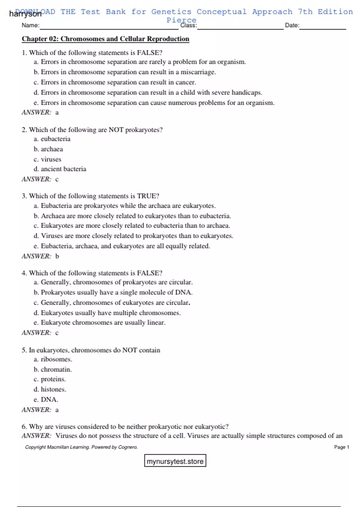 Test Bank For Genetics: A Conceptual Approach 7th Edition by Benjamin A. Pierce |9781319216801 | 2020/2021 | Chapter 1-26| Complete Questions and AnswersChapter 02: Chromosomes and Cellular Reproduction Copyright Macmillan Learning. Powered by Cognero. Page 1 1. Which of the following statements is FALSE? a. Errors in chromosome separation are rarely a problem for an organism. b. Errors in chromosome separation can result in a miscarriage. c. Errors in chromosome separation can result in cancer. d. Errors in chromosome separation can result in a child with severe handicaps. e. Errors in chromosome separation can cause numerous problems for an organism. ANSWER: a 2. Which of the following are NOT prokaryotes? a. eubacteria b. archaea c. viruses d. ancient bacteria ANSWER: c 3. Which of the following statements is TRUE? a. Eubacteria are prokaryotes while the archaea are eukaryotes. b. Archaea are more closely related to eukaryotes than to eubacteria. c. Eukaryotes are more closely related to eubacteria than to archaea. d. Viruses are more closely related to prokaryotes than to eukaryotes. e. Eubacteria, archaea, and eukaryotes are all equally related. ANSWER: b 4. Which of the following statements is FALSE? a. Generally, chromosomes of prokaryotes are circular. b. Prokaryotes usually have a single molecule of DNA. c. Generally, chromosomes of eukaryotes are circular. d. Eukaryotes usually have multiple chromosomes. e. Eukaryote chromosomes are usually linear. ANSWER: c 5. In eukaryotes, chromosomes do NOT contain a. ribosomes. b. chromatin. c. proteins. d. histones. e. DNA. ANSWER: a 6. Why are viruses considered to be neither prokaryotic nor eukaryotic? ANSWER: Viruses do not possess the structure of a cell. Viruses are actually simple structures composed of an DOWNLOAD THE Test Bank for Genetics Conceptual Approach 7th Edition Pierce harryson Name: Class: Date: Chapter 02: Chromosomes and Cellular Reproduction Copyright Macmillan Learning. Powered by Cognero. Page 2 outer protein coat surrounding nucleic acid. Viruses cannot reproduce outside of their host cells, suggesting that viruses evolved after cells were present and not before. 7. Prokaryotic chromosomes do NOT have telomeres because they a. do not go through mitosis. b. do not go through DNA replication. c. are in the cytoplasm. d. are circular. e. have no centromeres. ANSWER: d 8. In prokaryotes, replication usually begins at a specific place on the chromosome called the a. binary fission site. b. origin of replication. c. origin of mitosis. d. anchoring site. e. kinetochore. ANSWER: b 9. The highly organized internal scaffolding of the nucleus is called the a. histone complex. b. spindle microtubules. c. nuclear cohesion. d. nuclear matrix. e. nuclear envelope. ANSWER: d 10. The attachment point on the chromosome for spindle microtubules is the a. telomere. b. centromere. c. origin of replication. d. sister chromatid. e. allele. ANSWER: b 11. The process of splitting the cytoplasm, which separates one cell into two, is termed a. cytokinesis. b. mitosis. c. anaphase.