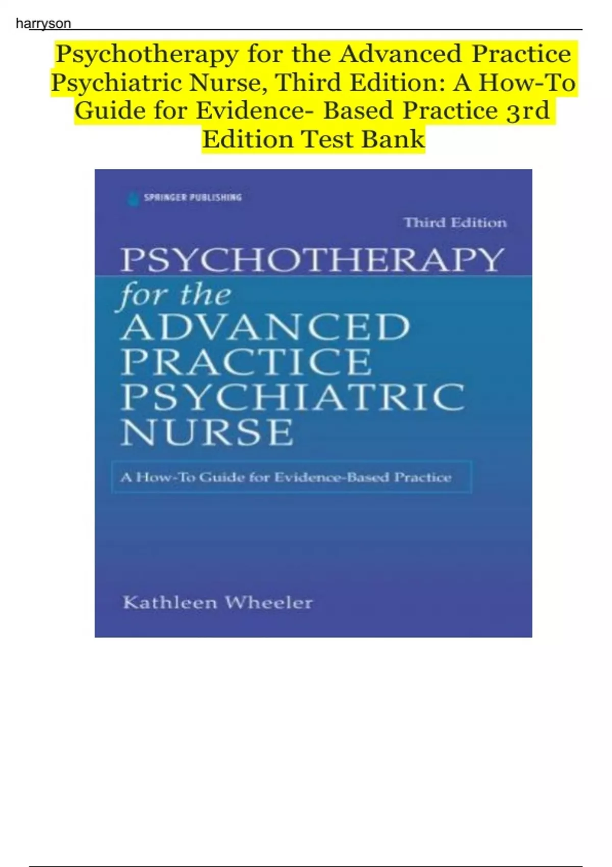 Psychotherapy for the advanced practice psychiatric nurse third edition a how to guide for evidence based practice 3rd Psychotherapy for the AdvancedPracticePsychiatric Nurse, Third Edition: AHow-ToGuide for Evidence- BasedPractice3rdEdition Test Bankharryson Psychotherapy for the AdvancedPracticePsychiatric Nurse, Third Edition: AHow-ToGuide for Evidence- BasedPractice3rdEdition Test BankPsychotherapy for the Advanced PracticePsychiatricNurse, Third Edition: A How-To Guidefor Evidence-Based Practice 3 rd Edition Test BankChapter 1. The Nurse Psychotherapist and a Framework for Practice Question 1 The nurses new job description at the generalist level of practice reflects the definition of psychiatricmentalhealth nursing and the PsychiatricMental Health Nursing Standards of Practice (ANA, APNA, ISPN). Inwhichof the following areas might the nurse plan programs and intervention to fulfill employment expectations?Standard Text: Select all that apply. 1. Stress management strategies 2.Early diagnosis of psychiatric disorders 3.Parenting classes for new parents 4.Family and group psychotherapy harryson Psychotherapy for the AdvancedPracticePsychiatric Nurse, Third Edition: AHow-ToGuide for Evidence- BasedPractice3rdEdition Test Bank5.Medication teaching for anti-anxiety medications Correct Answer: 1,3,4,5 Rationale 1: Stress management strategies address health, wellness, and care of mental health problemsandare appropriate for psychiatricmental health nursing at the generalist level of practice. Rationale 2: Early diagnosis of psychiatric disorders is generally not consistent with the definitionor harryson Psychotherapy for the AdvancedPracticePsychiatric Nurse, Third Edition: AHow-ToGuide for Evidence- BasedPractice3rdEdition Test Bankpractice of psychiatricmental health nursing especially at the generalist level. Rationale 3: Parenting classes for new parents provide teaching that is consistent with the preventionofmental health problems and is consistent with psychiatricmental health nursing at the generalist level of practice. Rationale 4: Family and group psychotherapy is consistent at the advanced practice registerednurselevelbutnot the generalist level. harryson Psychotherapy for the AdvancedPracticePsychiatric Nurse, Third Edition: AHow-ToGuide for Evidence- BasedPractice3rdEdition Test BankRationale 5: Medication teaching for anti-anxiety medications promotes quality of care for personswithpsychiatric disorders and is vital for psychiatricmental health nursing practice at the generalist level of practice.Global Rationale: Cognitive Level: Applying Client Need: Psychosocial Integrity Client Need Sub: Nursing/Integrated Concepts: Nursing Process: Planning Learning Outcome: Apply knowledge of current practice and professional performance standards tothedelivery of contemporary psychiatricmental health nursing. Question 2 Type: MCSA The nurse is serving on a committee charged with reviewing the roles and responsibilities of the nursesonthepsychiatric unit. Which publication should the nurse bring to the first meeting? 1. Diagnostic and Statistical Manual of Mental Disorders 2. American Nurses Credentialing Center certification requirements 3. American Nurses Association, Code of Ethics 4. PsychiatricMental Health Nursing Standards of Practice Correct Answer: 4 Rationale 1: The PsychiatricMental Health Nursing Standards of Practice delineates psychiatricmental health