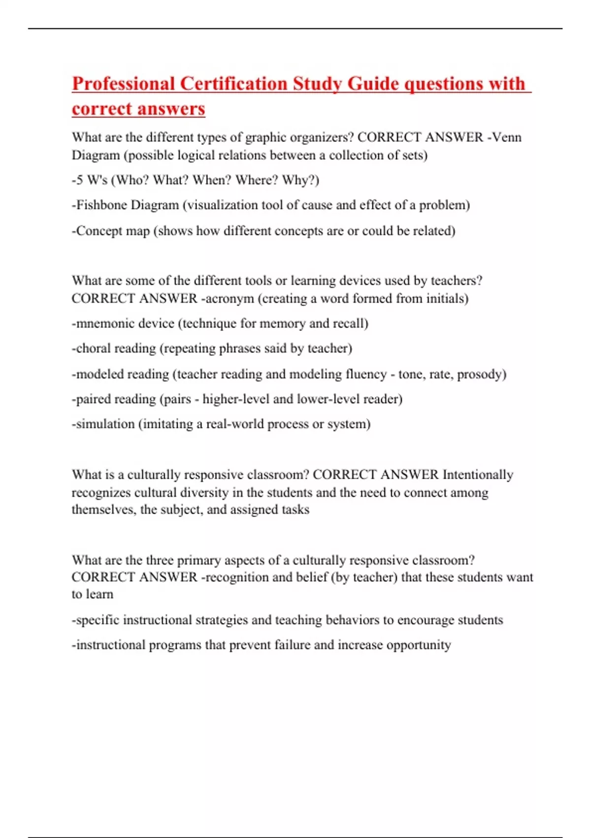 What are the different types of graphic organizers? CORRECT ANSWER -Venn Diagram (possible logical relations between a collection of sets) -5 W's (Who? What? When? Where? Why?) -Fishbone Diagram (visualization tool of cause and effect of a problem) -Concept map (shows how different concepts are or could be related) What are some of the different tools or learning devices used by teachers? CORRECT ANSWER -acronym (creating a word formed from initials) -mnemonic device (technique for memory and recall) -choral reading (repeating phrases said by teacher) -modeled reading (teacher reading and modeling fluency - tone, rate, prosody) -paired reading (pairs - higher-level and lower-level reader) -simulation (imitating a real-world process or system) What is a culturally responsive classroom? CORRECT ANSWER Intentionally recognizes cultural diversity in the students and the need to connect among themselves, the subject, and assigned tasks What are the three primary aspects of a culturally responsive classroom? CORRECT ANSWER -recognition and belief (by teacher) that these students want to learn -specific instructional strategies and teaching behaviors to encourage students -instructional programs that prevent failure and increase opportunity What are some examples of instructional meth