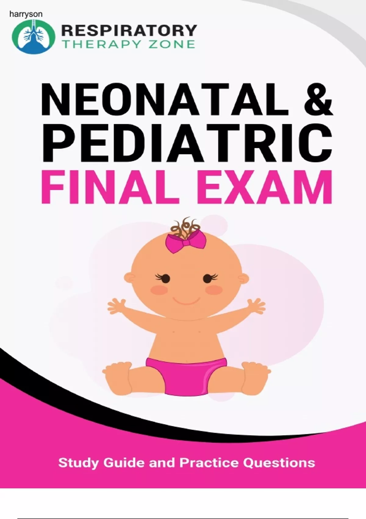 Neonatal and pediatric final exam reviewharryson Disclaimer: Medicine and respiratory therapy are continuously changing practices. The author and publisher have reviewed all information in this report with resources believed to be reliable and accurate and have made every effort to provide information that is up to date with the best practices at the time of publication. Despite our best efforts we cannot disregard the possibility of human error and continual changes in best practices the author, publisher, and any other party involved in the production of this work can warrant that the information contained herein is complete or fully accurate. The author, publisher, and all other parties involved in this work disclaim all responsibility from any errors contained within this work and from the results from the use of this information. Readers are encouraged to check all information in this book with institutional guidelines, other sources, and up to date information. Respiratory Therapy Zone is not affiliated with the NBRC, AARC, or any other group at the time of this publication. You can get access to our massive bank of TMC Practice Questions by Clicking Here. J Copyright © Respiratory Therapy Zone harryson Introduction Why hello there! Thank you so much for downloading this study guide! In this book, you will find a ton of helpful practice questions, all, of course, covering the topic of — Neonatal and Pediatric Respiratory Care. These questions are designed to help you prepare for the Neo/Peds final exam in Respiratory Therapy School. Hopefully, by going through these practice questions, you will be able to boost your knowledge to a whole new level and ace your final exam. This is definitely one of the most important subjects in Respiratory Therapy School. Not to mention, it’s also the topic that some students struggle with. With that being said, (hopefully) this study guide, along with the resources on our website and YouTube channel can help. So if you’re ready, let’s go ahead and get started. Good luck! J harryson 1. Which of the following statements describe truncus arteriosus? A. The pulmonary artery arises from the left ventricle, and the aorta stems from the right ventricle. B. A large VSD allows total mixing of blood from the two ventricles. C. If SVR decreases relative to PVR, blood flow will be shunted from right to left, bypassing the lungs. D. All of the above 2. What factor is responsible for closure of the foramen ovale? A. Increased PaO2 B. Increased pressure on the left side of the heart C. Blood flowing through the lungs D. High pulmonary vascular resistance 3. What is the incidence of respiratory distress syndrome (RDS) among infants born at less than 28 weeks of gestation? A. 30% to 40% B. 40% to 50% C. 60% to 80% D. >80% 4. What radiographic features is the therapist likely to see on a typical chest X-ray of an infant with MAS? A. Ground-glass appearance B. Complete whiteout C. Decreased lung volume D. Patchy areas of atelectasis 5. The therapist is treating a child with TOF who appears to be having a “tet” spell. What should the therapist suggest to treat this event? A. Beta blockers B. Knee-chest position to increase SVR C. Morphine sulfate D. All of the above harryson 6. The therapist is setting pulse oximetry to determine the presence of right-to-left shunt in an infant suspected of having a heart defect. Where should the therapist place the pulse ox probe to obtain the most accurate measure of preductal oxygen saturation? A. Any finger of the right hand B. Any finger of the left hand C. Left earlobe D. Lower extremities 7. Which of the following physiologic mechanisms need to be in place to ensure adequate systemic perfusion in infants with hypoplastic left heart syndrome (HLHS)? A. Presence of an ASD B. Presence of a mitral regurgitation C. Adequate left atrial function D. Presence of a PDA 8. Blood samples are simultaneously obtained from both the right radial artery and the umbilical artery, and the arterial partial pressure of oxygen (PaO2) value from the right radial artery is 20 mm Hg greater than that analyzed from the umbilical artery sample. On the basis of this finding, which of the following conditions does the neonate likely have? A. PPHN B. MAS C. Neonatal pneumonia D. RDS 9. What ventilator settings should a therapist select for a newborn with respiratory distress syndrome? A. PIP 25-30 cm H2O B. PEEP 3-6 cm H2O C. VT 5-6 mL/kg D. Frequency 60 breaths per minute