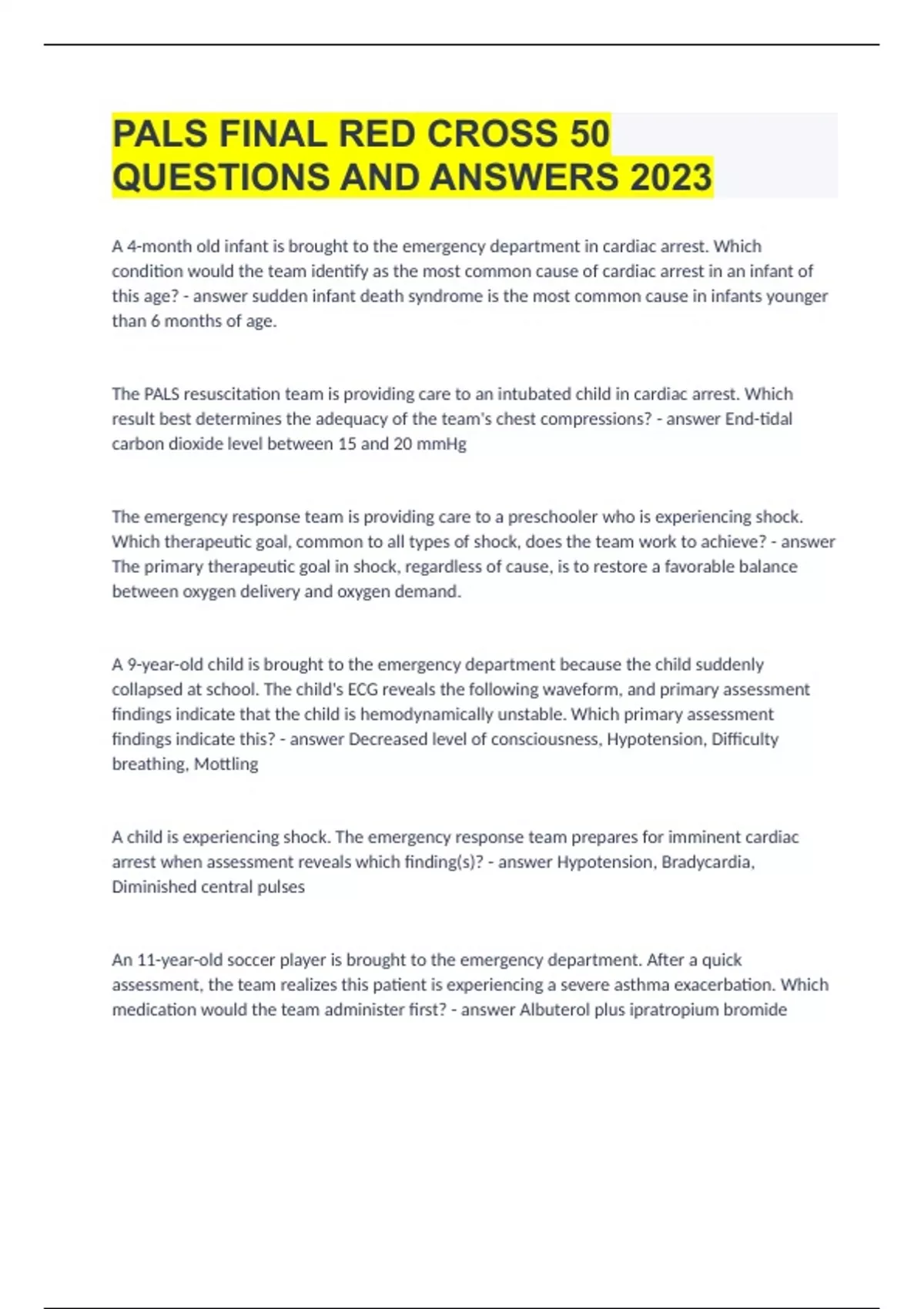 An 11-year-old soccer player is brought to the emergency department. After a quick assessment, the team realizes this patient is experiencing a severe asthma exacerbation. Which medication would the team administer first? - answer Albuterol plus ipratropium bromide The PALS team is providing post-cardiac arrest care to an 8-year-old child in the pediatric intensive care unit. Which intervention would the team implement to achieve the primary goal of post-cardiac arrest care? - answer Ensuring adequate mean arterial pressure