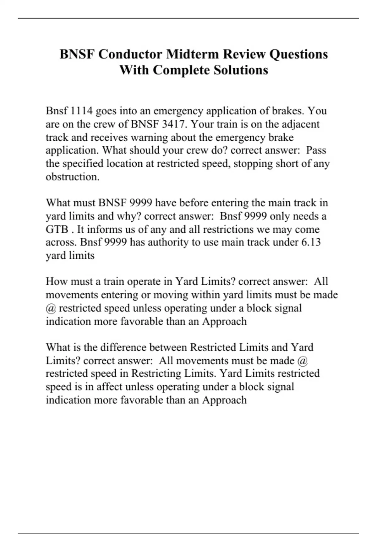 BNSF Conductor Midterm Review Questions With Complete Solutions