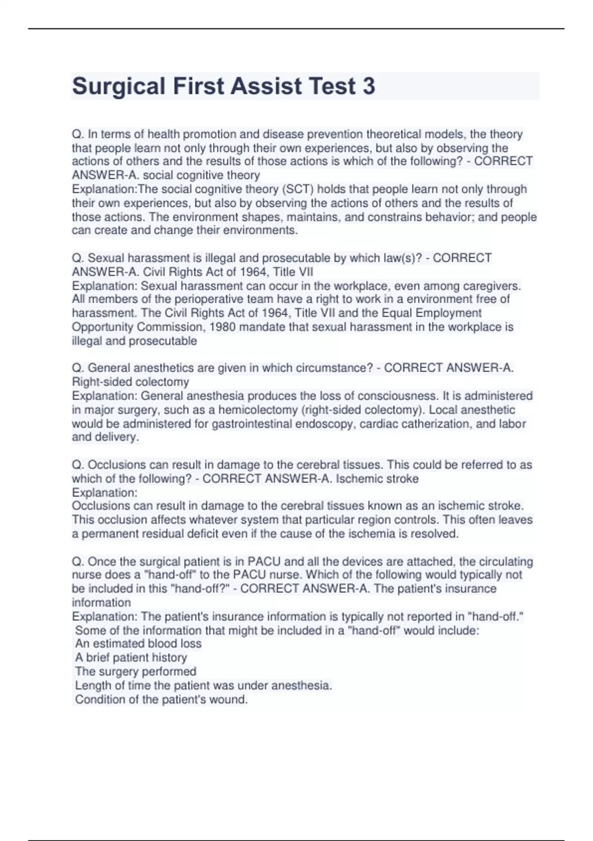 Surgical First Assist Test 3 Q. In terms of health promotion and disease prevention theoretical models, the theory that people learn not only through their own experiences, but also by observing the actions of others and the results of those actions is which of the following? - CORRECT ANSWER-A. social cognitive theory Explanation:The social cognitive theory (SCT) holds that people learn not only through their own experiences, but also by observing the actions of others and the results of those actions. The environment shapes, maintains, and constrains behavior; and people can create and change their environments. Q. Sexual harassment is illegal and prosecutable by which law(s)? - CORRECT ANSWER-A. Civil Rights Act of 1964, Title VII Explanation: Sexual harassment can occur in the workplace, even among caregivers. All members of the perioperative team have a right to work in a environment free of harassment. The Civil Rights Act of 1964, Title VII and the Equal Employment Opportunity Commission, 1980 mandate that sexual harassment in the workplace is illegal and prosecutable Q. General anesthetics are given in which circumstance? - CORRECT ANSWER-A. Right-sided colectomy Explanation: General anesthesia produces the loss of consciousness. It is administered in major surgery, such as a hemicolectomy (right-sided colectomy). Local anesthetic would be administered for gastrointestinal endoscopy, cardiac catherization, and labor and delivery. Q. Occlusions can result in damage to the cerebral tissues. This could be referred to as which of the following? - CORRECT ANSWER-A. Ischemic stroke Explanation: Occlusions can result in damage to the cerebral tissues known as an ischemic stroke. This occlusion affects whatever system that particular region controls. This often leaves a permanent residual deficit even if the cause of the ischemia is resolved. Q. Once the surgical patient is in PACU and all the devices are attached, the circulating nurse does a "hand-off" to the PACU nurse. Which of the following would typically not be included in this "hand-off?" - CORRECT ANSWER-A. The patient's insurance information Explanation: The patient's insurance information is typically not reported in "hand-off." Some of the information that might be included in a "hand-off" would include: An estimated blood loss A brief patient history The surgery performed Length of time the patient was under anesthesia. Condition of the patient's wound. ASA score Any complications Information regarding family members Q. The organization that maintains the nation's organ transplant waiting list is which of the following? - CORRECT ANSWER-A. United Network for Organ Sharing Explanation: The United Network for Organ Sharing (UNOS) maintains the nation's organ transplant waiting list. This is done under contract with the Health Resources and Services Administration of the U.S. Department of Health and Human Services (DHHS). UNOS's organ-sharing policy, Required Request, increases the probability of a successful transplant. Q. When a local anesthetic is being administered, the scrub technician dispenses it to the surgeon. Which of the following would be considered a responsibility of the scrub technician at this time? - CORRECT ANSWER-A. The scrub technician shares the responsibility to ensure that the maximum dosage of the medication is not exceeded and the scrub technician should confirm the maximum dosage of the medication with the anesthesia care provider prior to the case starting. Explanation: The scrub technician should confirm the maximum dosage of the medication with the anesthesia care provider prior to the case starting. Documentation of the maximum dosage along with the increment amounts should be documented in real time by the nurse circulator. Q. A noncrushing clamp would be temporarily used for which of the following? - CORRECT ANSWER-A. To occlude bowel and to occlude major blood vessels. Explanation: The noncrushing clamps are used to occlude bowel and to occlude major blood vessels. These are effective in these cases because they minimize the trauma to the tissues. Q. The main organisms that cause sepsis that may lead to septic shock are which of the following? - CORRECT ANSWER-A. gram-negative and gram-positive bacteria Explanation: The main organisms that cause sepsis are gram-negative and grampositive bacteria. Parasites, fungi, and viruses canalso lead to the development of sepsis and septic shock. Q. An indication that the patient has a knowledge deficit is which of the following? - CORRECT ANSWER-A. Inaccurate follow-through with previous instructions Explanation: The patient who has difficulty following through on instructions may have a knowledge deficit. When giving instructions, the perioperative nurse will want ensure the patient understands terminology and recommendations Q. Cellulitis is inflammation of what? - CORRECT ANSWER-A. Subcutaneous, loose connective tissue Explanation: Cellulitis is inflammation of the tissue beneath the dermal layer, the subcutaneous, loose connective tissue. Inflammation of this tissue at the wound site is a sign of infection. Q. Of the following, which would be the correct term for the study of drugs? - CORRECT ANSWER-A. Pharmacology Explanation: An antagonists would be a drug that blocks a receptor mediated response. An antibiotic is a drug that inhibits the growth of or kills a bacteria. The study of drugs is considered pharmacology. Q. Supply cabinets or carts in the operating rooms can consist of which of the following types? - CORRECT ANSWER-A. A pass through cabinet, surgical carts and glass shelves with sliding doors in the operating room. Explanation: There are different types of supply carts or shelves in different facilities. These can include the cabinets which can be made of stainless steel, glass or wire shelving to help minimize the dust accumulation. A pass-through cabinet entry allows for the transfer of supplies from outside the OR and yet circulates cl