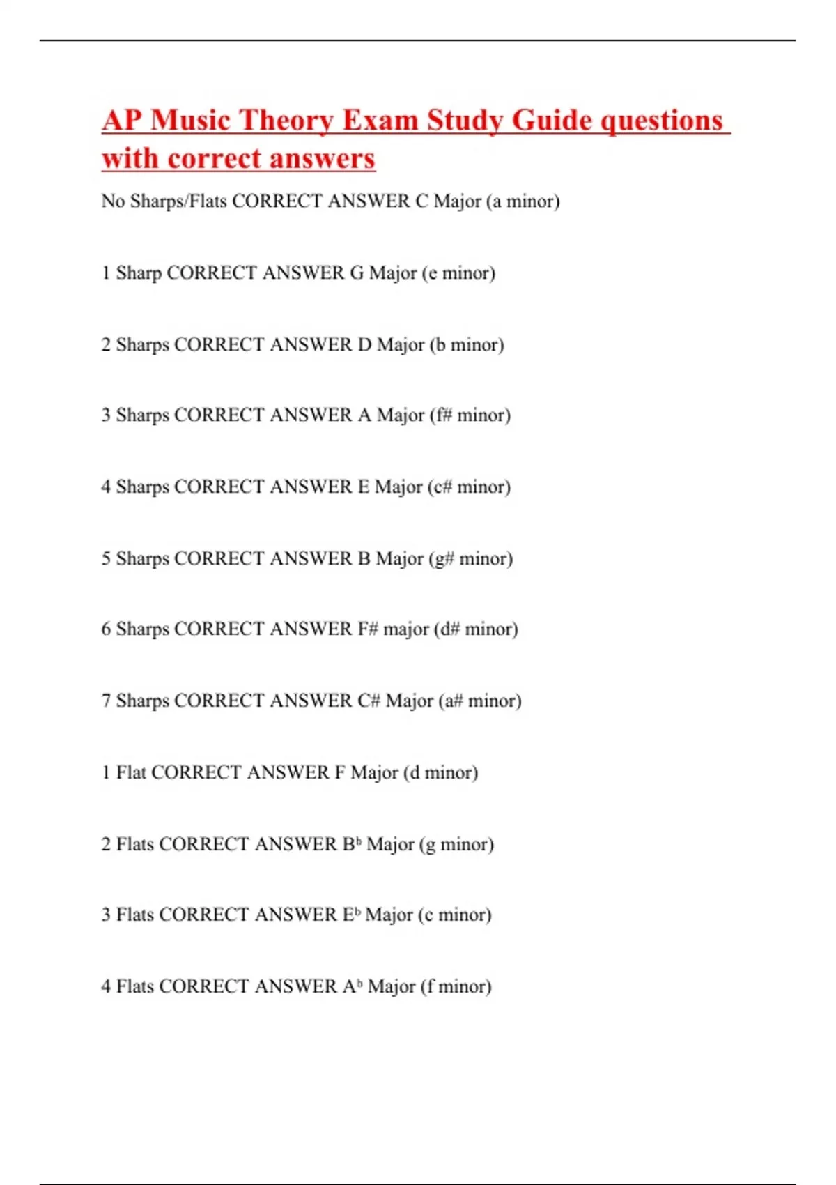 No Sharps/Flats CORRECT ANSWER C Major (a minor) 1 Sharp CORRECT ANSWER G Major (e minor) 2 Sharps CORRECT ANSWER D Major (b minor) 3 Sharps CORRECT ANSWER A Major (f# minor) 4 Sharps CORRECT ANSWER E Major (c# minor) 5 Sharps CORRECT ANSWER B Major (g# minor) 6 Sharps CORRECT ANSWER F# major (d# minor) 7 Sharps CORRECT ANSWER C# Major (a# minor) 1 Flat CORRECT ANSWER F Major (d minor) 2 Flats CORRECT ANSWER Bᵇ Major (g minor) 3 Flats CORRECT ANSWER Eᵇ Major (c minor) 4 Flats CORRECT ANSWER Aᵇ Major (f minor)