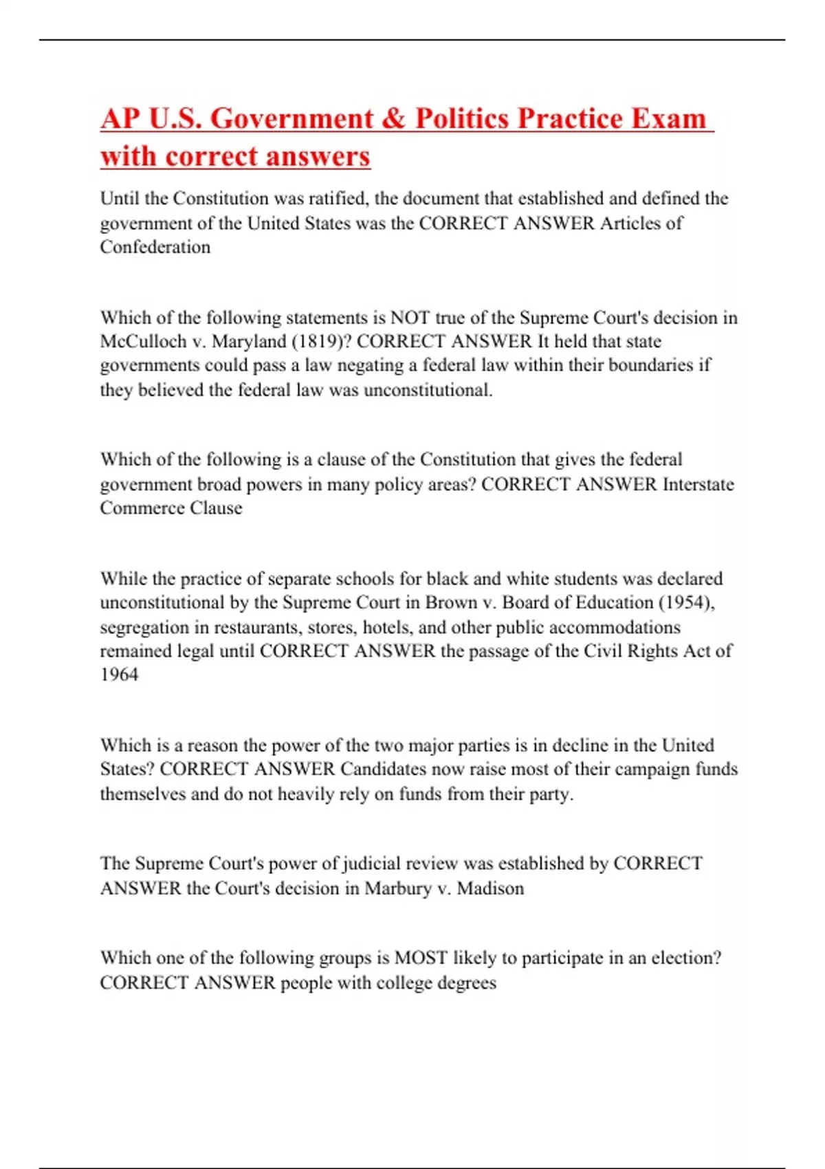 Until the Constitution was ratified, the document that established and defined the government of the United States was the CORRECT ANSWER Articles of Confederation Which of the following statements is NOT true of the Supreme Court's decision in McCulloch v. Maryland (1819)? CORRECT ANSWER It held that state governments could pass a law negating a federal law within their boundaries if they believed the federal law was unconstitutional. Which of the following is a clause of the Constitution that gives the federal government broad powers in many policy areas? CORRECT ANSWER Interstate Commerce Clause While the practice of separate schools for black and white students was declared unconstitutional by the Supreme Court in Brown v. Board of Education (1954), segregation in restaurants, stores, hotels, and other public accommodations remained legal until CORRECT ANSWER the passage of the Civil Rights Act of 1964 Which is a reason the power of the two major parties is in decline in the United States? CORRECT ANSWER Candidates now raise most of their campaign funds themselves and do not heavily rely on funds from their party. The Supreme Court's power of judicial review was established by CORRECT ANSWER the Court's decision in Marbury v. Madison Which one of the following groups is MOST likely to participate in an election? CORRECT ANSWER people with college degrees
