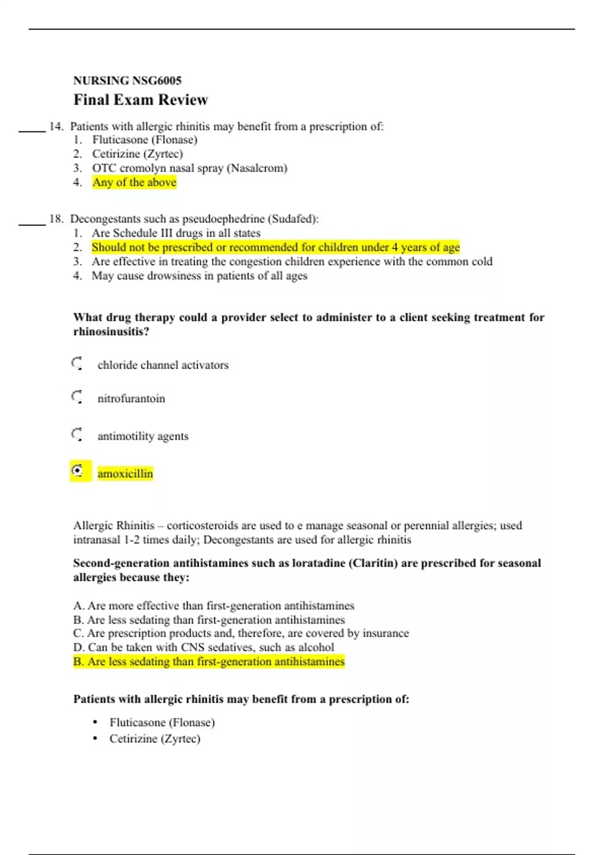NURSING NSG6005 Final Exam Review 14. Patients with allergic rhinitis may benefit from a prescription of: 1. Fluticasone (Flonase) 2. Cetirizine (Zyrtec) 3. OTC cromolyn nasal spray (Nasalcrom) 4. Any of the above 18. Decongestants such as pseudoephedrine (Sudafed): 1. Are Schedule III drugs in all states 2. Should not be prescribed or recommended for children under 4 years of age 3. Are effective in treating the congestion children experience with the common cold 4. May cause drowsiness in patients of all ages What drug therapy could a provider select to administer to a client seeking treatment for rhinosinusitis? chloride channel activators nitrofurantoin antimotility agents amoxicillin Allergic Rhinitis – corticosteroids are used to e manage seasonal or perennial allergies; used intranasal 1-2 times daily; Decongestants are used for allergic rhinitis Second-generation antihistamines such as loratadine (Claritin) are prescribed for seasonal allergies because they: A. Are more effective than first-generation antihistamines B. Are less sedating than first-generation antihistamines C. Are prescription products and, therefore, are covered by insurance D. Can be taken with CNS sedatives, such as alcohol B. Are less sedating than first-generation antihistamines Patients with allergic rhinitis may benefit from a prescription of: • Fluticasone (Flonase) • Cetirizine (Zyrtec) • OTC cromolyn nasal spray (Nasalcrom) • All of the above Nonpharmacological therapy includes increasing fluid intake, using nonmedicated cough drops, nasal saline spray/drops to decrease viscosity of nasal secretions, and rest. Anorexia is often associated with the common cold and fluids may need to be forced to maintain hydration. Infants who are congested cannot breathe and feed at the same time causing fluid intake to be inadequate. Nasal suctioning may be required to clear secretions. Oral decongestants are used for the temporary relief of nasal congestion from the common cold, sinus infections, and allergic rhinitis. They may be used to promote nasal or sinus drainage and are also indicated in the relief of eustachian tube congestion. Pseudoephedrine for those over 4 y/o Viral URI (the common cold) are self-limiting and require no treatment, the goal is relieving irritating symptoms, specifically nasal congestion. ANTIBIOTICS HAVE NO PLACE IN THE TREATMENT OF VIRAL URIs. They can cause antimicrobial resistances to secondary bacterial infections. Antihistamines have not been shown to change the course of the common cold. But many OTC medications contain antihistamines, most likely for their “drying out” effect. Decongestants are the mainstay treatment for the common cold (systemic or topical). Tylenol/Ibuprofen/ASA can be given for fever and malaise. Topical decongestants are safe for 3 consecutive days of use. Topical decongestants adverse effects – transient stinging, burning, sneezing, dryness, local irritation, rebound congestion with prolonged use. Topical decongestants can symptomatically relieve nasal congestion and relieve ear blockage and pressure pain. Topical decongestant adverse reactions – insomnia, dizziness, weakness, tremor, or irregular heartbeat. Topical decongestant meds – Afrin, phenylephrine, oxylmetazoline, Neo-Synephrine Theophylline – a bronchodilator that can affect the blood pressure Monitor decongestant use in cardiac patients as they can increase hypertension from the added vasoconstriction. A diabetic client with high blood pressure and a pacemaker is seeking relief from excess mucous production due to the common cold. Why would a provider not recommend decongestants to this client? The risk for contraindications is high. The risk for poor metabolism of the drug is high. The efficacy of the drug will be low due to the client’s other health conditions. Older adults are more likely to have adverse reactions from decongestants. Common complications for URIs – Sinusitis, otitis media, asthma exacerbation Echinacea is widely used in Europe, and increasing use in the US, for prevention of the common cold and flu and is considered an herbal remedy. How can a provider assess airflow limitation? By examining the natural expiratory volume and total volume of exhaled air and their difference By examining the forced expiratory volume and total volume of exhaled air and their ratio By examining the relaxed state of the expiratory volume and last recorded volume of exhaled air and their sum By examining the elicited expiratory volume and limited volume of exhaled air and their quotient Albuterol, beta agonists, is generally considered the first-choice medication for treatment of asthma. Inhaled corticosteroids are recommended as first-line therapy for athletes who have persistent asthma to prevent worsening symptoms with exercise. How is first-line treatment for COPD the same as for asthma? Both diseases require maintenance therapies. Both diseases are treated based on the number of hospitalizations. Both diseases results from first- or second-hand smoking. Both diseases are first always treated with short-acting muscarinic antagonists (SAMAs). Mast cell stabilizer – cromolyn; works by inhibiting antigen-induced bronchospasm, blocks histamine release, stabilizes mast cells. Monoclonal antibody binds to free IgE and prevents them from responding to relevant allergens 13. What is the desired mixed of T3 to T4 drug levels in newly diagnosed endocrine patients? 1. 99% of T3 and the rest is T4 to get rapid resolution. 2. Most needs to be T4 to mimic natural ratios of hormone. 3. The ratio is unimportant. 4. The mix needs to be 50-50 at first. 3. After starting a patient with Grave’s disease on an antithyroid agent such as methimazole, patient monitoring includes TSH and free T4 every: 1. 1 to 2 weeks 2. 3 to 4 weeks 3. 2 to 3 months 4. 6 to 9 months