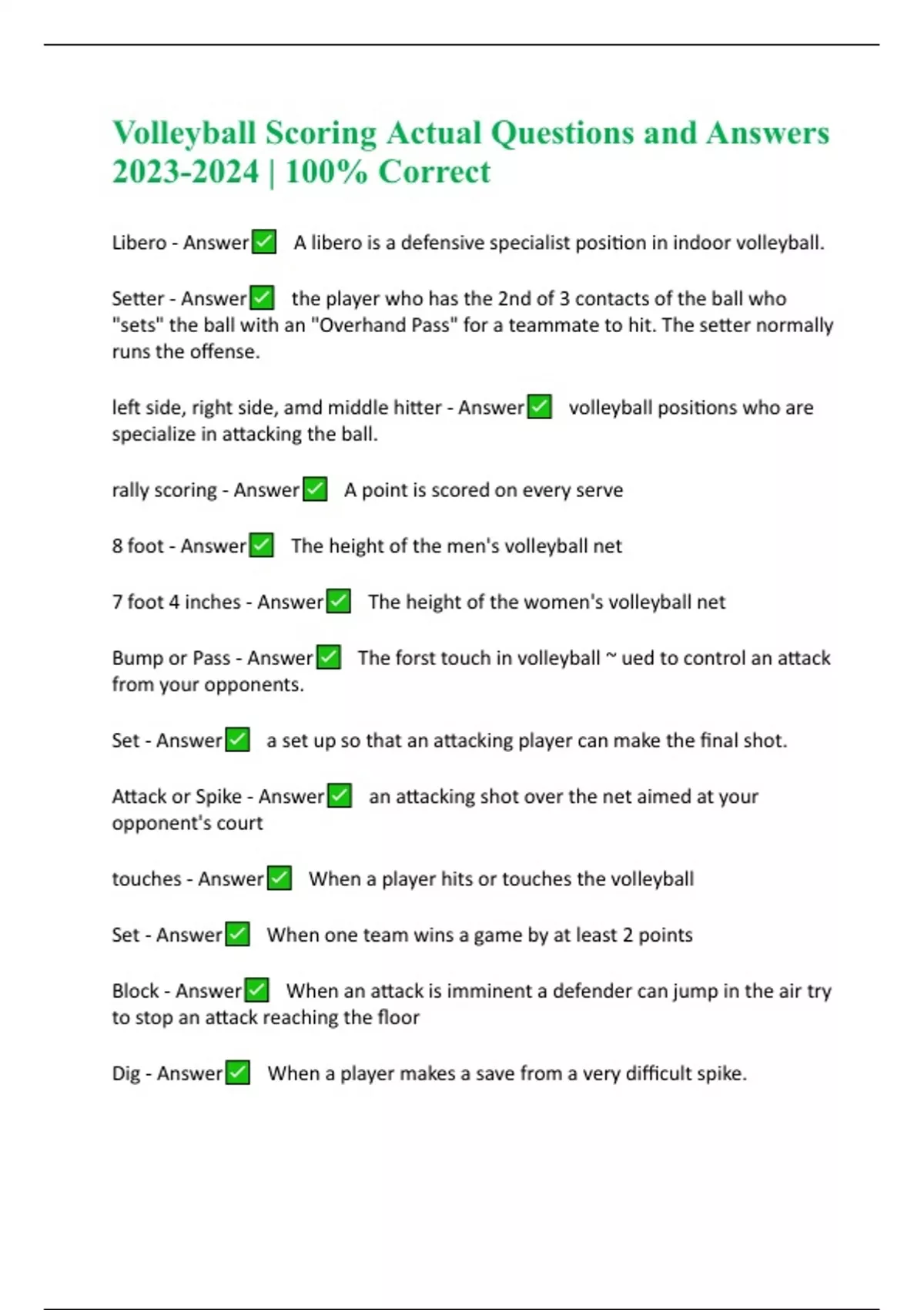 Volleyball Scoring Actual Questions and Answers | 100% Correct