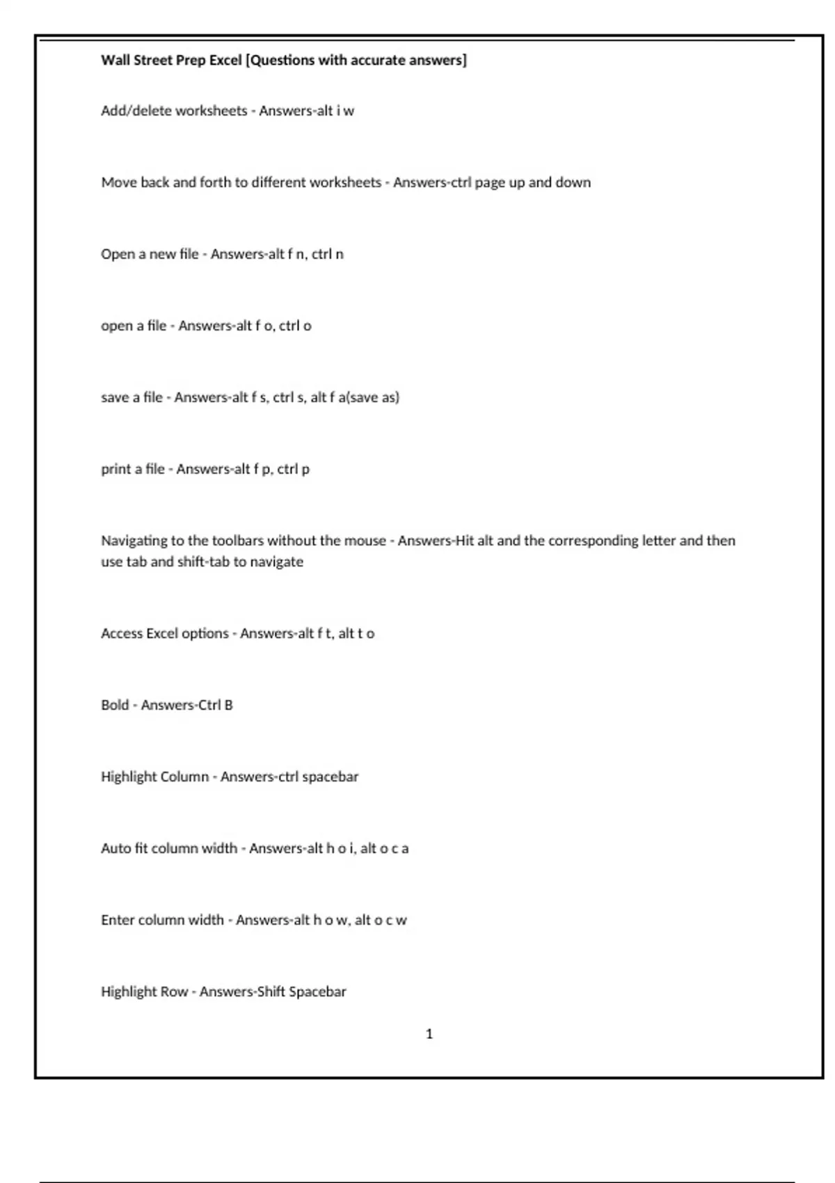 Move back and forth to different worksheets - Answers-ctrl page up and down Open a new file - Answers-alt f n, ctrl n open a file - Answers-alt f o, ctrl o save a file - Answers-alt f s, ctrl s, alt f a(save as) print a file - Answers-alt f p, ctrl p Navigating to the toolbars without the mouse - Answers-Hit alt and the corresponding letter and then use tab and shift-tab to navigate