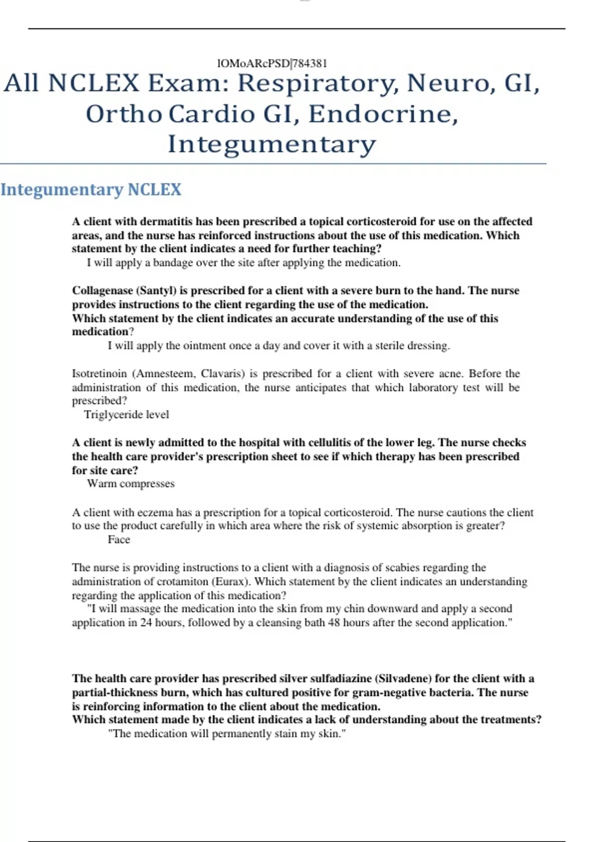 All NCLEX Exam Respiratory, Neuro, GI, Ortho Cardio GI, Endocrine, Integumentary All NCLEX Exam Respiratory, Neuro, GI, Ortho Cardio GI, Endocrine, Integumentary- FOR BEST NCLEX SCORES