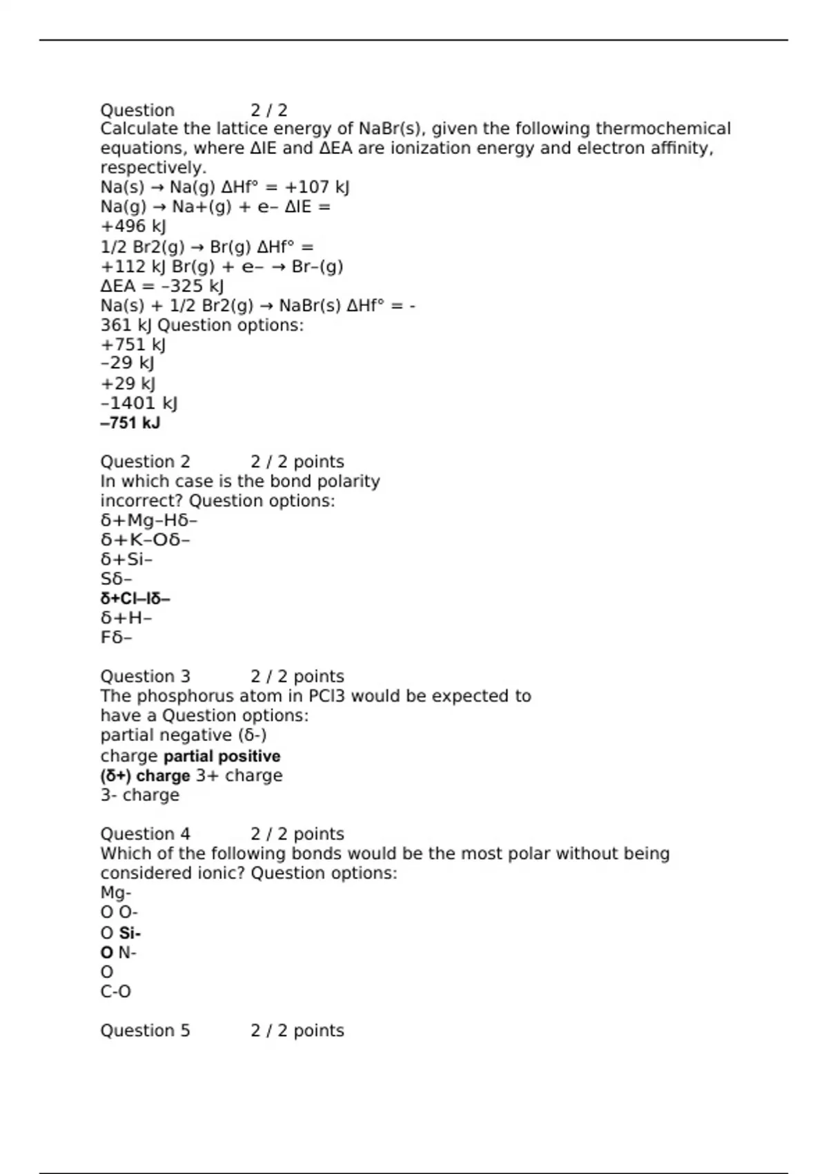 1. Question: Calculate the lattice energy of NaBr(s), given the following thermochemical equations, where ΔIE and ΔEA are ionization energy and electron affinity, respectively. 2. Question: In which case is the bond polarity incorrect? 3. Question: The phosphorus atom in PCl3 would be expected to have a 4. Question: Which of the following bonds would be the most polar without being considered ionic? 5. Question: Calculate the standard enthalpy of formation (ΔHformation) for LiCl(s) given the following data using the Born-Haber cycle: 6. Question: The hybridization of the nitrogen atom in the cation NH2+ is: 7. Question: For which of these molecules does the best Lewis structure have two or more equivalent resonance structures? 8. Question: Each of the three resonance structures of NO3– has how many lone pairs of electrons? 9. Question: How many double and single bonds are in the resonance form for SO2 in which the formal charges on each atom are zero? 10. Question: The hybridization of the central atom in XeF5+ is: 11. Question: Silver crystallizes in a face-centered cubic structure. What is the edge length of the unit cell if the atomic radius of silver is 144 pm? 12. Question: The number of atoms in a body-centered cubic unit cell is: 13. Question: The radius of an indium atom is 0.163 nm. If indium crystallizes in a face-centered unit cell, what is the length of an edge of the unit cell? 14. Question: Cesium has a radius of 272 pm and crystallizes in a body-centered cubic structure. What is the edge length of the unit cell? 15. Question: Which one of the following crystallizes in a metallic lattice? 16. Question: Which of the following is not a state function? 17. Question: A 3.9 g sample of Colorado oil shale is burned in a bomb calorimeter, which causes the temperature of the calorimeter to increase by 5.0°C. The calorimeter contains 1.00 kg of water (heat capacity of H2O = 4.184 J/g°C) and the heat capacity of the empty calorimeter is 0.10 kJ/°C. How much heat is released per gram of oil shale when it is burned? 18. Question: Two metals of equal mass with different heat capacities are subjected to the same amount of heat. Which undergoes the smallest change in temperature? 19. Question: For most chemical reactions 20. Question: How much heat is transferred per mole of NH3(g) formed in the reaction shown below? 21. Question: Three 1.00-L flasks at 25°C and 725 torr contain the gases CH4 (flask A), CO2 (flask B), and C2H6 (flask C). In which flask is there 0.039 mol of gas? 22. Question: A physics experiment is conducted at a pressure of 14.0 kPa. What is this pressure in mmHg? 23. Question: Which gas has the highest density? 24. Question: For which gas do the molecules have the highest average velocity? 25. Question: 10.0 g of gaseous ammonia and 6.50 g of oxygen gas are introduced into a previously evacuated 5.50 L vessel. If the ammonia and oxygen then react to yield NO gas and water vapor, what is the final gas pressure inside the vessel at 23oC? 26. Question: For the electronic transition from n = 2 to n = 4 in the hydrogen atom. 27. Question: For the electronic transition from n = 3 to n = 5 in the hydrogen atom. 28. Question: Draw Lewis dot (electron) structure for SF6 and determine the following: 29. Question: Given C22-, using molecular orbital and valence bond theory; 30. Question: Substances with high lattice energies tend to be less soluble than substances with low lattice energies. On that basis predict the relative aqueous solubility at 20 °C, from highest to lowest, of the following ionic compounds: Ce2(SO4)3, K2SO4, KBr, NaCl. 31. Question: A metal crystallizes with a face-centered cubic lattice. The edge of the unit cell is 408 pm. Calculate the number of atoms in the unit cell and diameter of the metal atom. 32. Question: Question: A 25.0 g piece of aluminum (which has a molar heat capacity of 24.03 J/ °C.mol) is heated 82.4 °C and dropped into a calorimeter containing water (specific heat capacity of water is 4.18 J/g.oC) initially at 22.3 °C. The final temperature of the water is 24.9 °C. Calculate the mass of water in the calorimeter. 33. Question: Consider the following standard heats of formation: 34. Question: What volume of CO2(g) is produced at 27 °C and 778 torr from the combustion of 10.50 L of C2H6(g)? 35. Question: Calculate the temperature of 2.50 g CO2 gas occupies 5.60 liters at 789 torr in oC