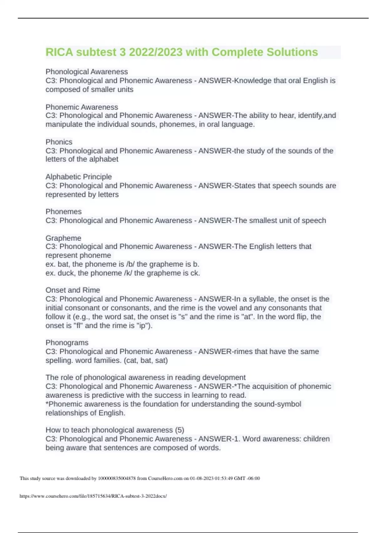 RICA subtest with Complete Solutions
