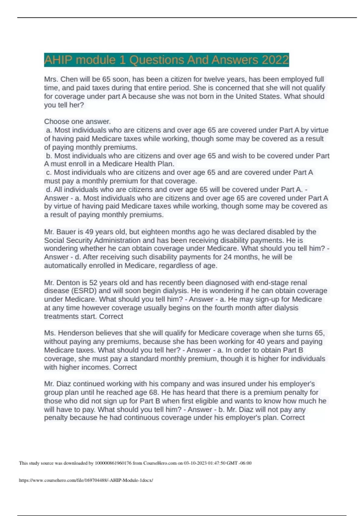 Mrs. Chen will be 65 soon, has been a citizen for twelve years, has been employed full time, and paid taxes during that entire period. She is concerned that she will not qualify for coverage under part A because she was not born in the United States. What should you tell her? Choose one answer. a. Most individuals who are citizens and over age 65 are covered under Part A by virtue of having paid Medicare taxes while working, though some may be covered as a result of paying monthly premiums. b. Most individuals who are citizens and over age 65 and wish to be covered under Part A must enroll in a Medicare Health Plan. c. Most individuals who are citizens and over age 65 and are covered under Part A must pay a monthly premium for that coverage. d. All individuals who are citizens and over age 65 will be covered under Part A. - Answer - a. Most individuals who are citizens and over age 65 are covered under Part A by virtue of having paid Medicare taxes while working, though some may be covered as a result of paying monthly premiums.