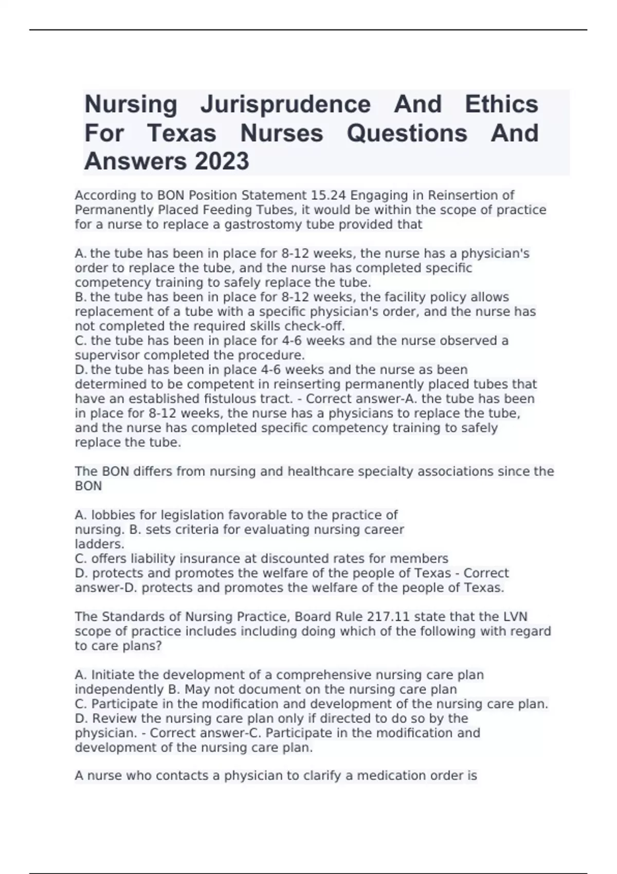 Nursing Jurisprudence and Ethics for Texas Nurses Questions And Answers 2023