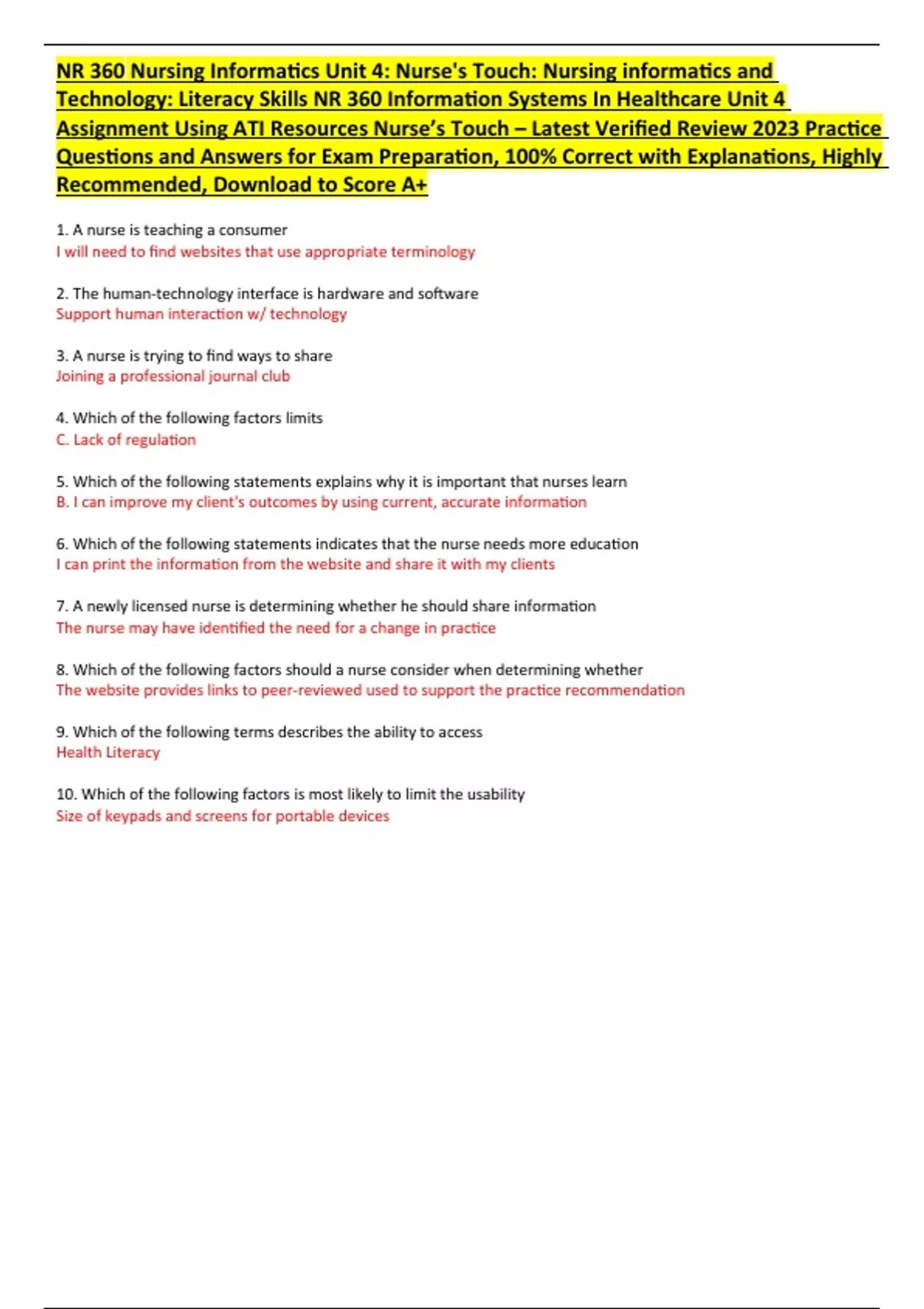 NR 360 Nursing Informatics Unit 4: Nurse's Touch: Nursing informatics and Technology: Literacy Skills NR 360 Information Systems In Healthcare Unit 4 Assignment Using ATI Resources Nurse’s Touch – Latest Verified Review 2023 Practice Questions and Answers for Exam Preparation, 100% Correct with Explanations, Highly Recommended, Download to Score A+ 1. A nurse is teaching a consumer I will need to find websites that use appropriate terminology 2. The human-technology interface is hardware and software Support human interaction w/ technology 3. A nurse is trying to find ways to share Joining a professional journal club