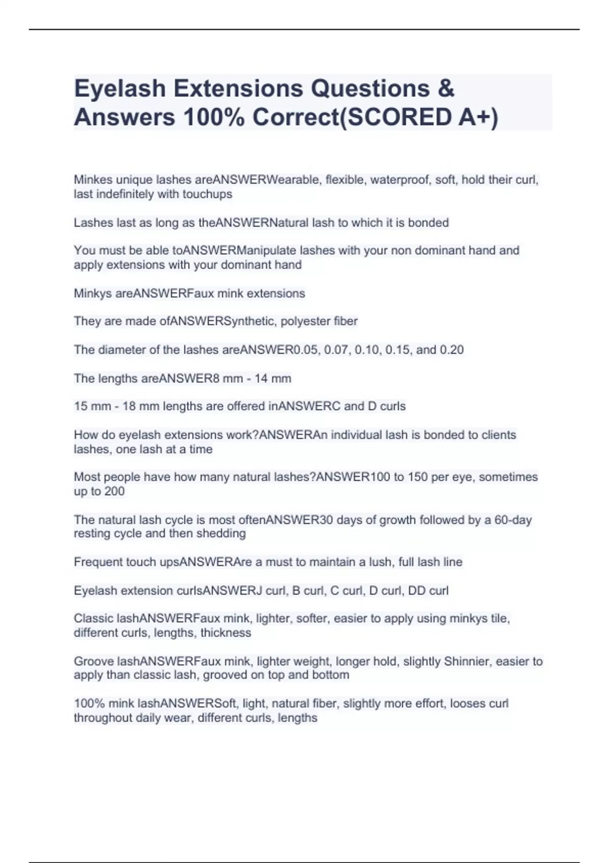 Eyelash Extensions Questions & Answers 100% Correct(SCORED A+)