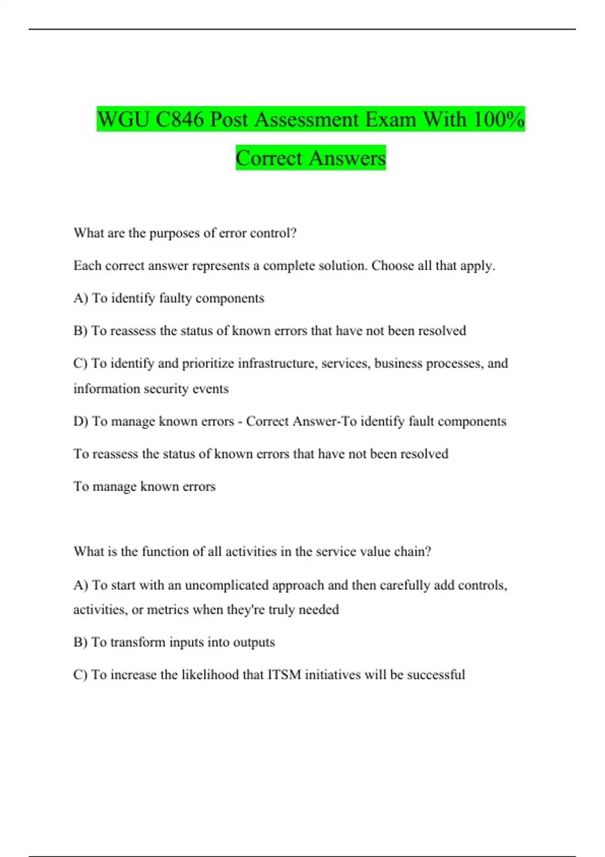 What are the purposes of error control? Each correct answer represents a complete solution. Choose all that apply. A) To identify faulty components B) To reassess the status of known errors that have not been resolved C) To identify and prioritize infrastructure, services, business processes, and information security events D) To manage known errors - Correct Answer-To identify fault components To reassess the status of known errors that have not been resolved To manage known errors What is the function of all activities in the service value chain? A) To start with an uncomplicated approach and then carefully add controls, activities, or metrics when they're truly needed B) To transform inputs into outputs C) To increase the likelihood that ITSM initiatives will be successful D) To maintain alignment through a clear set of shared principles and objectives - Correct Answer-To transform inputs into outputs Which of the following are the sources of information analysis for service-level management? Each correct answer represents a complete solution. Choose all that apply. A) Business metrics B) IT asset management C) Operational metrics D) Customer feedback - Correct Answer-Business metrics Operational metrics Customer feedback