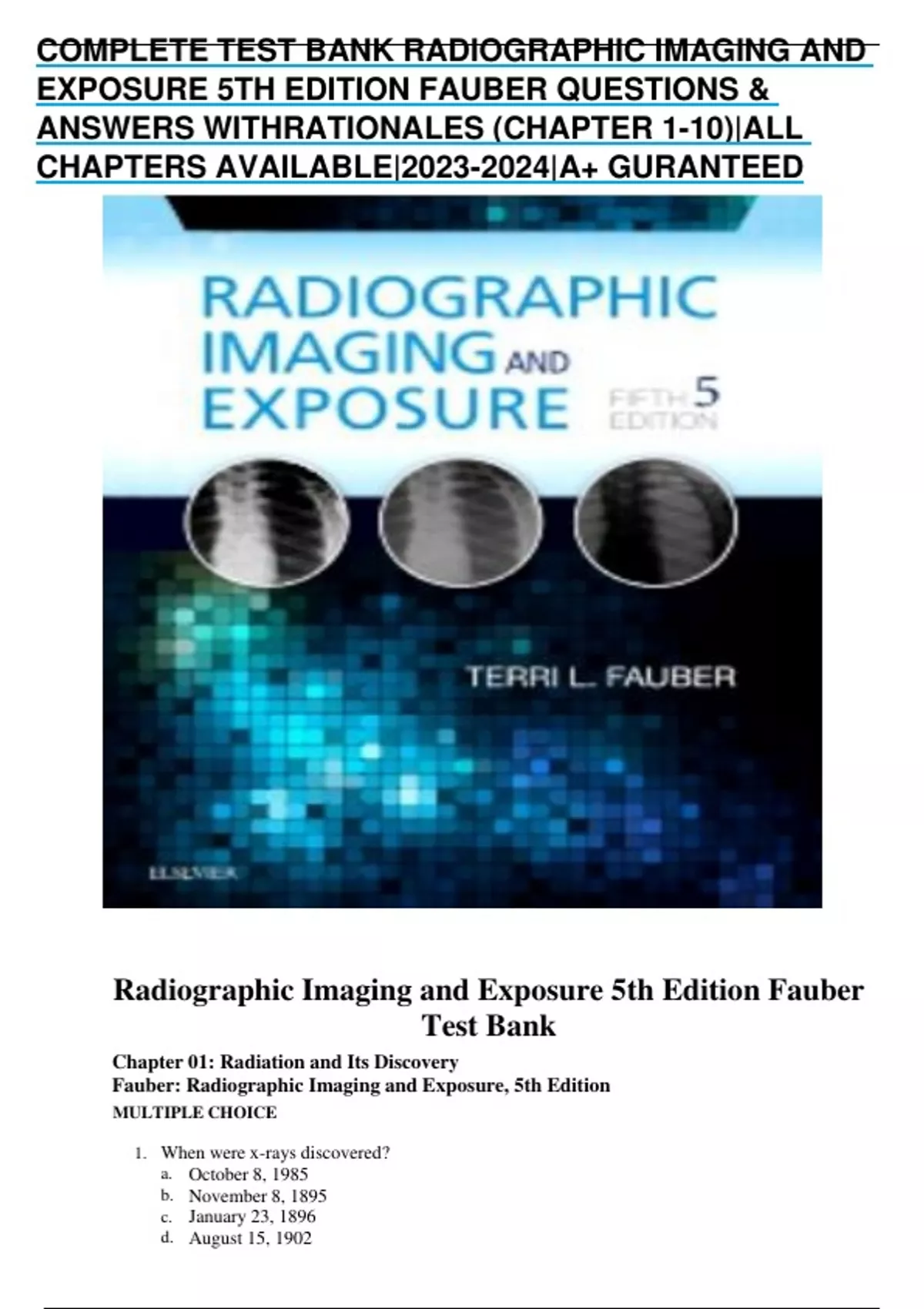 COMPLETE TEST BANK RADIOGRAPHIC IMAGING AND EXPOSURE 5TH EDITION FAUBER QUESTIONS & ANSWERS WITH RATIONALES (CHAPTER 1-10)|ALL CHAPTERS AVAILABLE||A+ GURANTEED