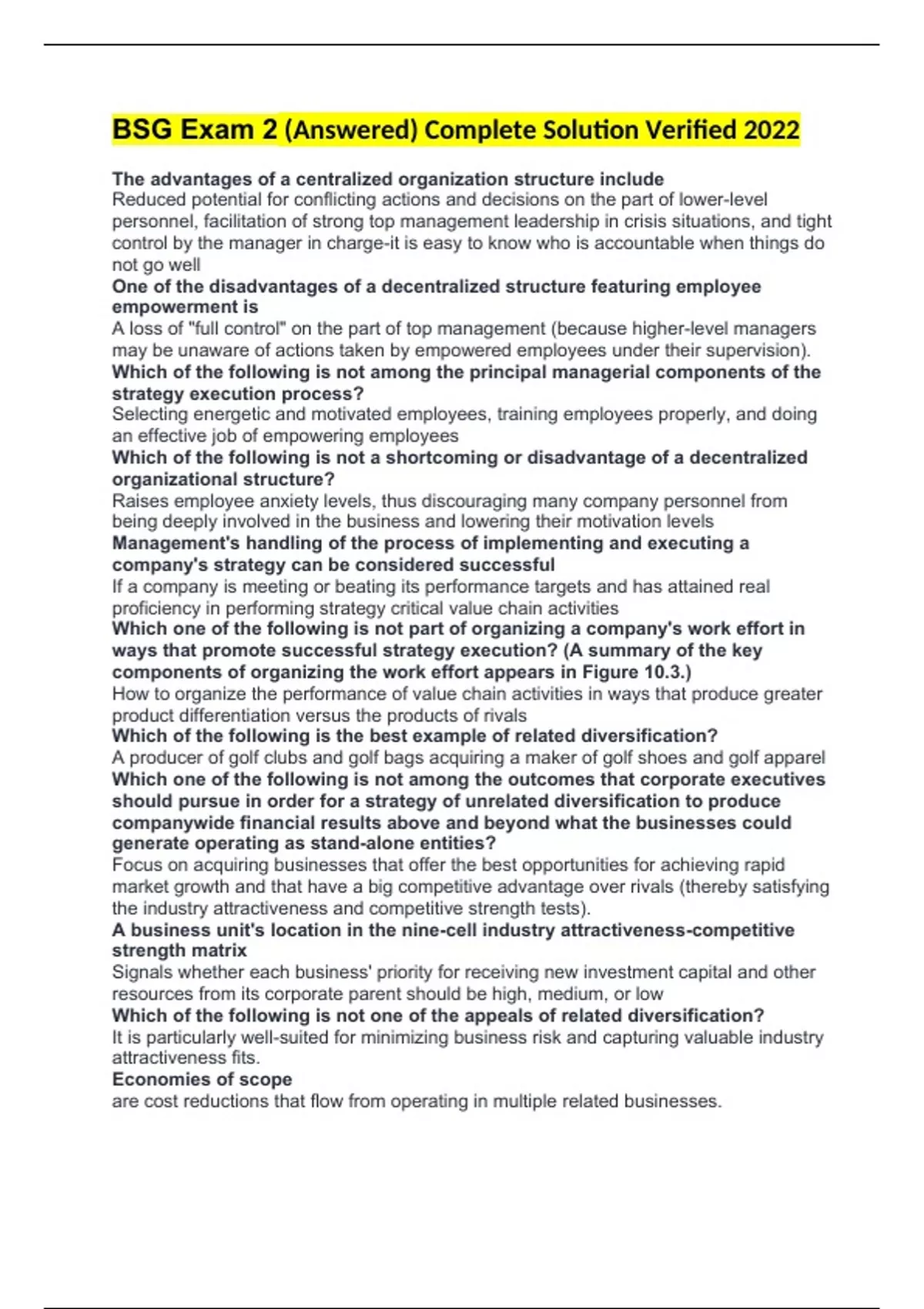 BSG Exam 2 (Answered) Complete Solution Verified 2022
