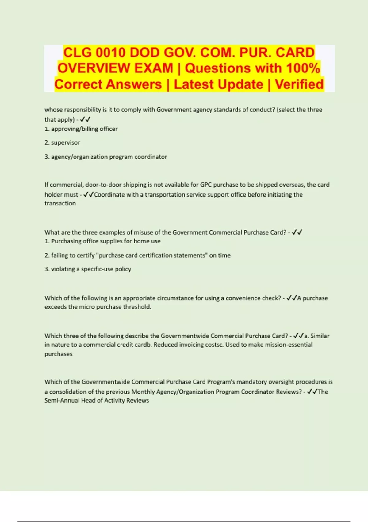 CLG 0010 DOD GOV. COM. PUR. CARD OVERVIEW EXAM | Questions with 100% Correct Answers | Latest Update | Verified whose responsibility is it to comply with Government agency standards of conduct? (select the three that apply) - 1. approving/billing officer 2. supervisor 3. agency/organization program coordinator If commercial, door-to-door shipping is not available for GPC purchase to be shipped overseas, the card holder must - Coordinate with a transportation service support office before initiating the transaction What are the three examples of misuse of the Government Commercial Purchase Card? - 1. Purchasing office supplies for home use 2. failing to certify "purchase card certification statements" on time 3. violating a specific-use policy Which of the following is an appropriate circumstance for using a convenience check? - A purchase exceeds the micro purchase threshold. Which three of the following describe the Governmentwide Commercial Purchase Card? - a. Similar in nature to a commercial credit cardb. Reduced invoicing costsc. Used to make mission-essential purchases Which of the Governmentwide Commercial Purchase Card Program's mandatory oversight procedures is a consolidation of the previous Monthly Agency/Organization Program Coordinator Reviews? - The Semi-Annual Head of Activity Review