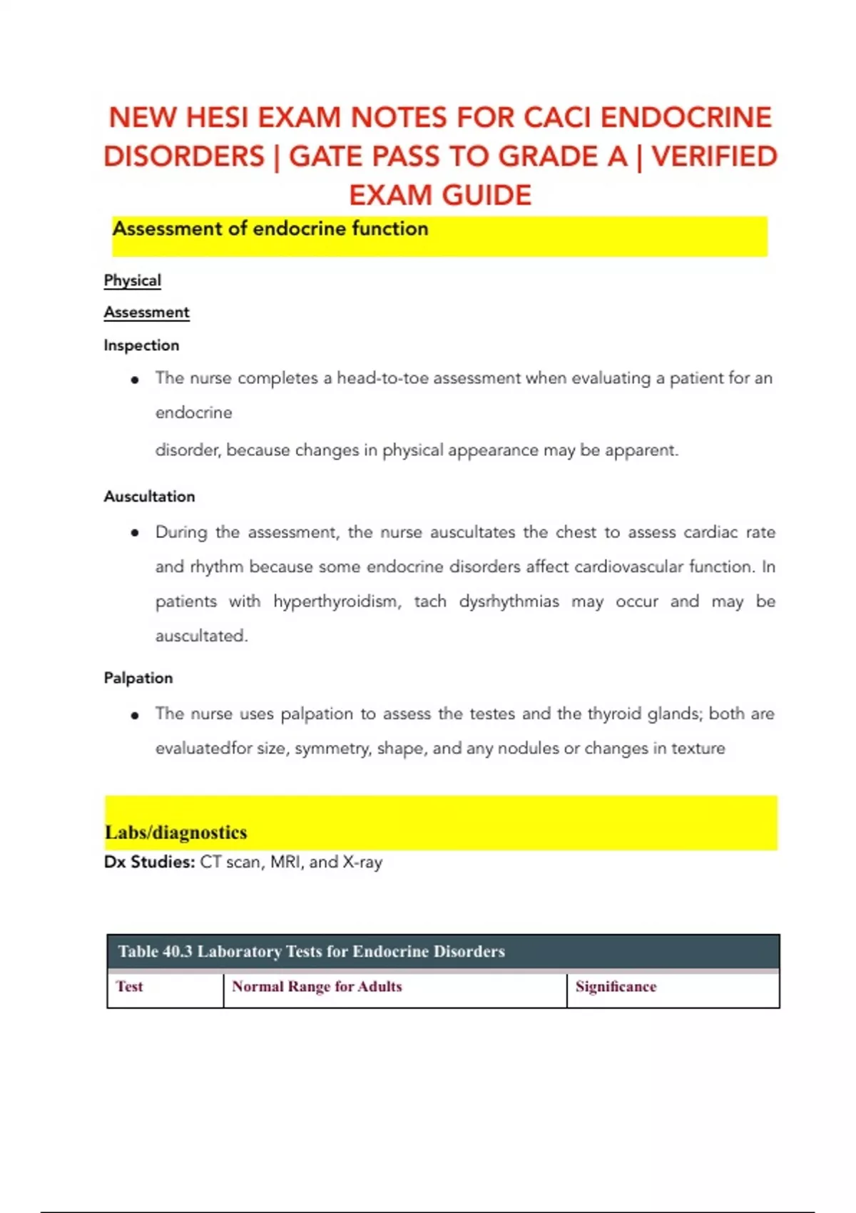 NEW HESI EXAM NOTES FOR CACI ENDOCRINE DISORDERS | GATE PASS TO GRADE A | VERIFIED EXAM GUIDE Assessment of endocrine function Physical Assessment Inspection ● The nurse completes a head-to-toe assessment when evaluating a patient for an endocrine disorder, because changes in physical appearance may be apparent. Auscultation ● During the assessment, the nurse auscultates the chest to assess cardiac rate and rhythm because some endocrine disorders affect cardiovascular function. In patients with hyperthyroidism, tach dysrhythmias may occur and may be auscultated. Palpation ● The nurse uses palpation to assess the testes and the thyroid glands; both are evaluated for size, symmetry, shape, and any nodules or changes in texture Dx Studies: CT scan, MRI, and X-ray Table 40.3 Laboratory Tests for Endocrine Disorders Test Normal Range for Adults Signi