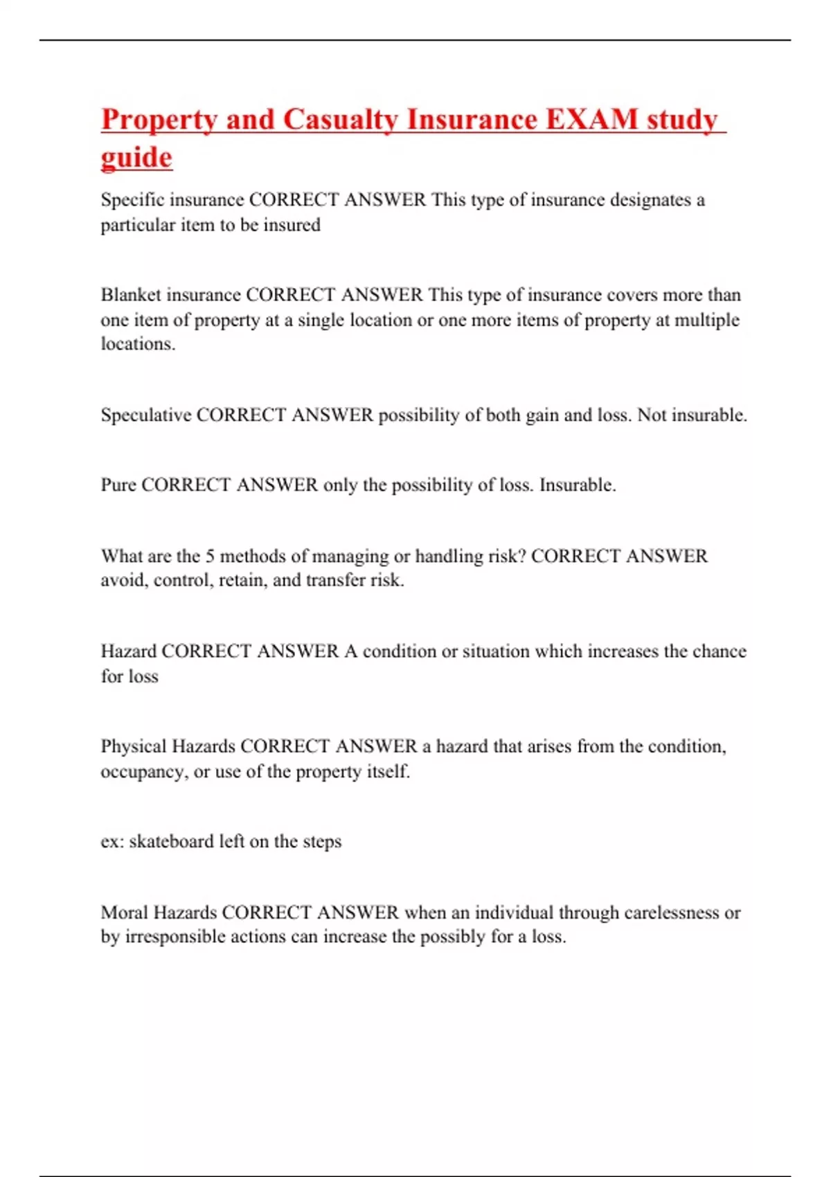 Specific insurance CORRECT ANSWER This type of insurance designates a particular item to be insured Blanket insurance CORRECT ANSWER This type of insurance covers more than one item of property at a single location or one more items of property at multiple locations. Speculative CORRECT ANSWER possibility of both gain and loss. Not insurable. Pure CORRECT ANSWER only the possibility of loss. Insurable. What are the 5 methods of managing or handling risk? CORRECT ANSWER avoid, control, retain, and transfer risk. Hazard CORRECT ANSWER A condition or situation which increases the chance for loss Physical Hazards CORRECT ANSWER a hazard that arises from the condition, occupancy, or use of the property itself. ex: skateboard left on the steps Moral Hazards CORRECT ANSWER when an individual through carelessness or by irresponsible actions can increase the possibly for a loss.