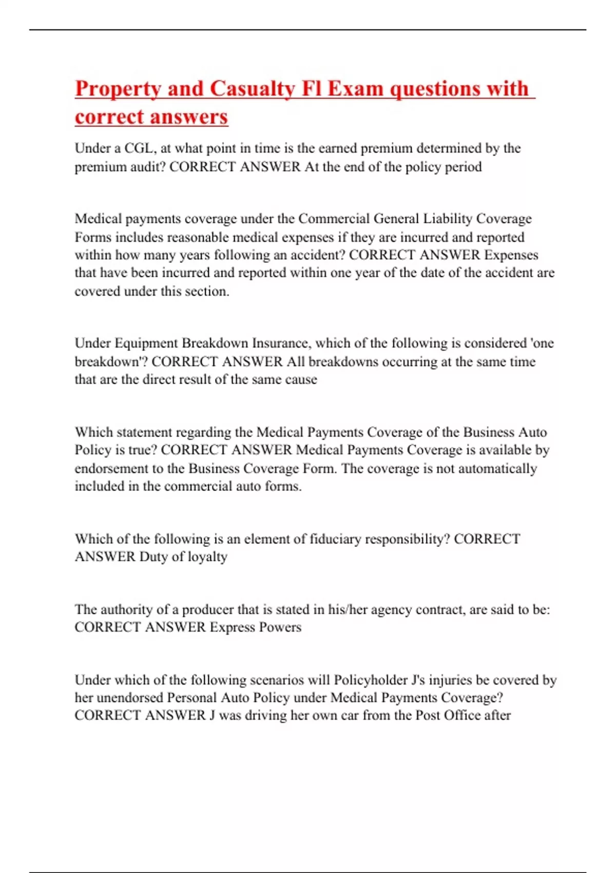 Under a CGL, at what point in time is the earned premium determined by the premium audit? CORRECT ANSWER At the end of the policy period Medical payments coverage under the Commercial General Liability Coverage Forms includes reasonable medical expenses if they are incurred and reported within how many years following an accident? CORRECT ANSWER Expenses that have been incurred and reported within one year of the date of the accident are covered under this section. Under Equipment Breakdown Insurance, which of the following is considered 'one breakdown'? CORRECT ANSWER All breakdowns occurring at the same time that are the direct result of the same cause Which statement regarding the Medical Payments Coverage of the Business Auto Policy is true? CORRECT ANSWER Medical Payments Coverage is available by endorsement to the Business Coverage Form. The coverage is not automatically included in the commercial auto forms. Which of the following is an element of fiduciary responsibility? CORRECT ANSWER Duty of loyalty The authority of a producer that is stated in his/her agency contract, are said to be: CORRECT ANSWER Express Powers