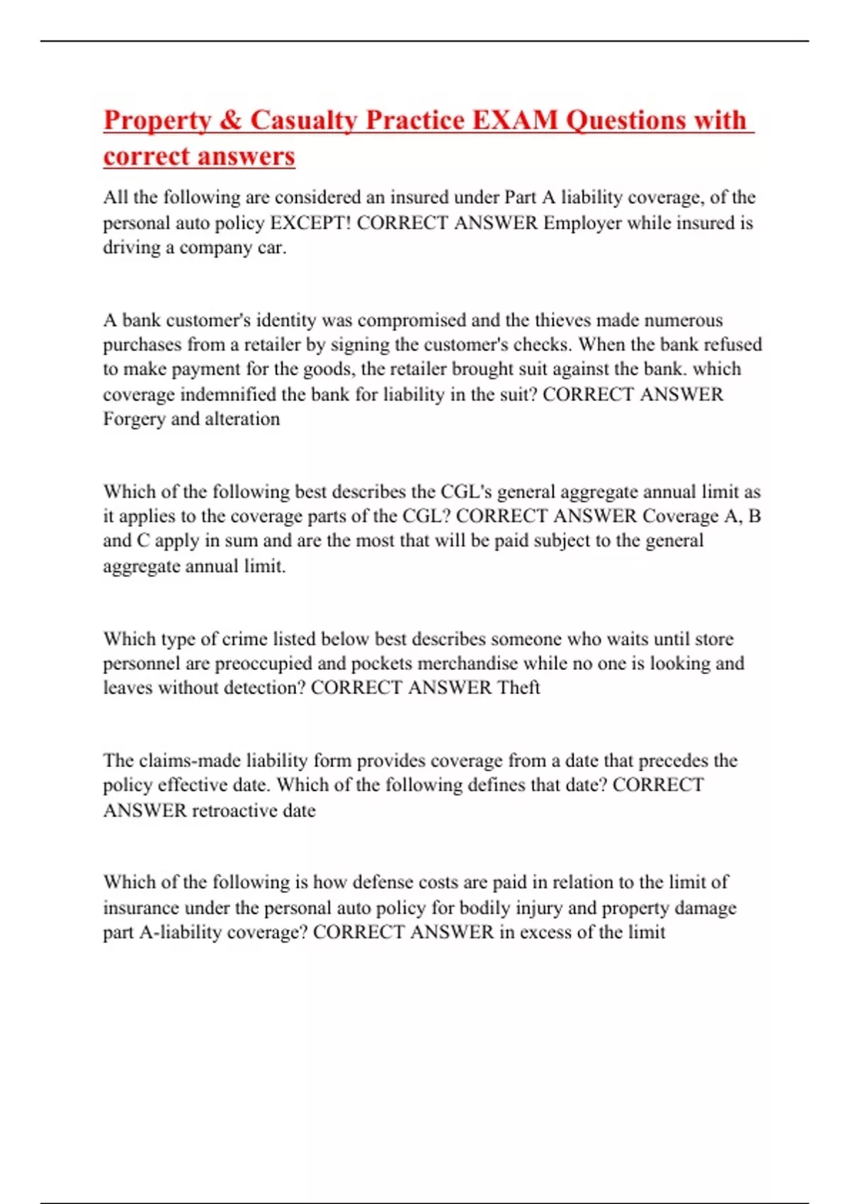 All the following are considered an insured under Part A liability coverage, of the personal auto policy EXCEPT! CORRECT ANSWER Employer while insured is driving a company car. A bank customer's identity was compromised and the thieves made numerous purchases from a retailer by signing the customer's checks. When the bank refused to make payment for the goods, the retailer brought suit against the bank. which coverage indemnified the bank for liability in the suit? CORRECT ANSWER Forgery and alteration Which of the following best describes the CGL's general aggregate annual limit as it applies to the coverage parts of the CGL? CORRECT ANSWER Coverage A, B and C apply in sum and are the most that will be paid subject to the general aggregate annual limit. Which type of crime listed below best describes someone who waits until store personnel are preoccupied and pockets merchandise while no one is looking and leaves without detection? CORRECT ANSWER Theft The claims-made liability form provides coverage from a date that precedes the policy effective date. Which of the following defines that date? CORRECT ANSWER retroactive date Which of the following is how defense
