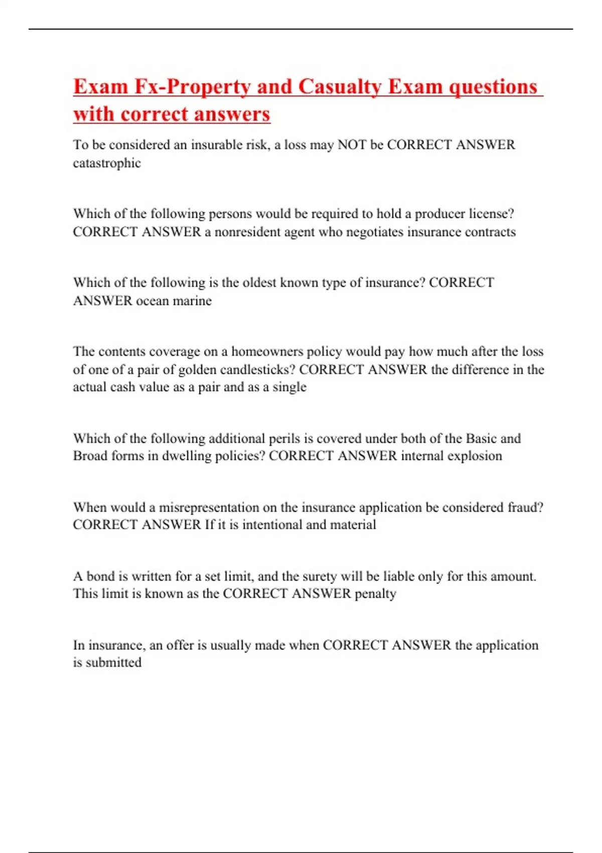Exam Fx-Property and Casualty Exam questions with correct answers
