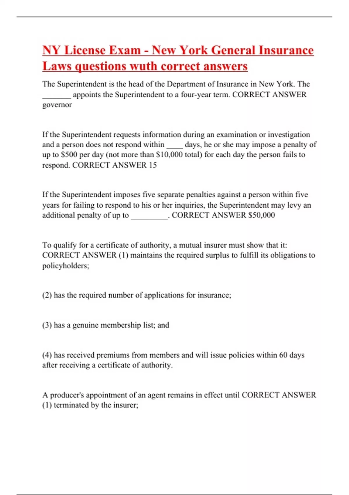 The Superintendent is the head of the Department of Insurance in New York. The _______ appoints the Superintendent to a four-year term. CORRECT ANSWER governor If the Superintendent requests information during an examination or investigation and a person does not respond within ____ days, he or she may impose a penalty of up to $500 per day (not more than $10,000 total) for each day the person fails to respond. CORRECT ANSWER 15 If the Superintendent imposes five separate penalties against a person within five years for failing to respond to his or her inquiries, the Superintendent may levy an additional penalty of up to _________. CORRECT ANSWER $50,000 To qualify for a certificate of authority, a mutual insurer must show that it: CORRECT ANSWER (1) maintains the required surplus to fulfill its obligations to policyholders; (2) has the required number of applications for insurance; (3) has a genuine membership list; and (4) has received premiums from members and will issue policies within 60 days after receiving a certificate of authority. A producer's appointment of an agent remains in effect until CORRECT ANSWER (1) terminated by the insurer;