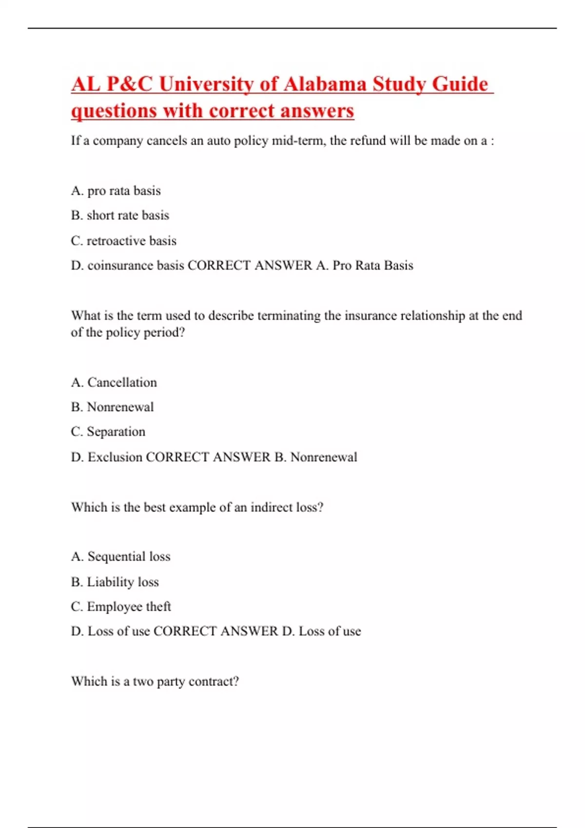 If a company cancels an auto policy mid-term, the refund will be made on a : A. pro rata basis B. short rate basis C. retroactive basis D. coinsurance basis CORRECT ANSWER A. Pro Rata Basis What is the term used to describe terminating the insurance relationship at the end of the policy period? A. Cancellation B. Nonrenewal C. Separation D. Exclusion CORRECT ANSWER B. Nonrenewal Which is the best example of an indirect loss? A. Sequential loss B. Liability loss C. Employee theft D. Loss of use CORRECT ANSWER D. Loss of use Which is a two party contract?