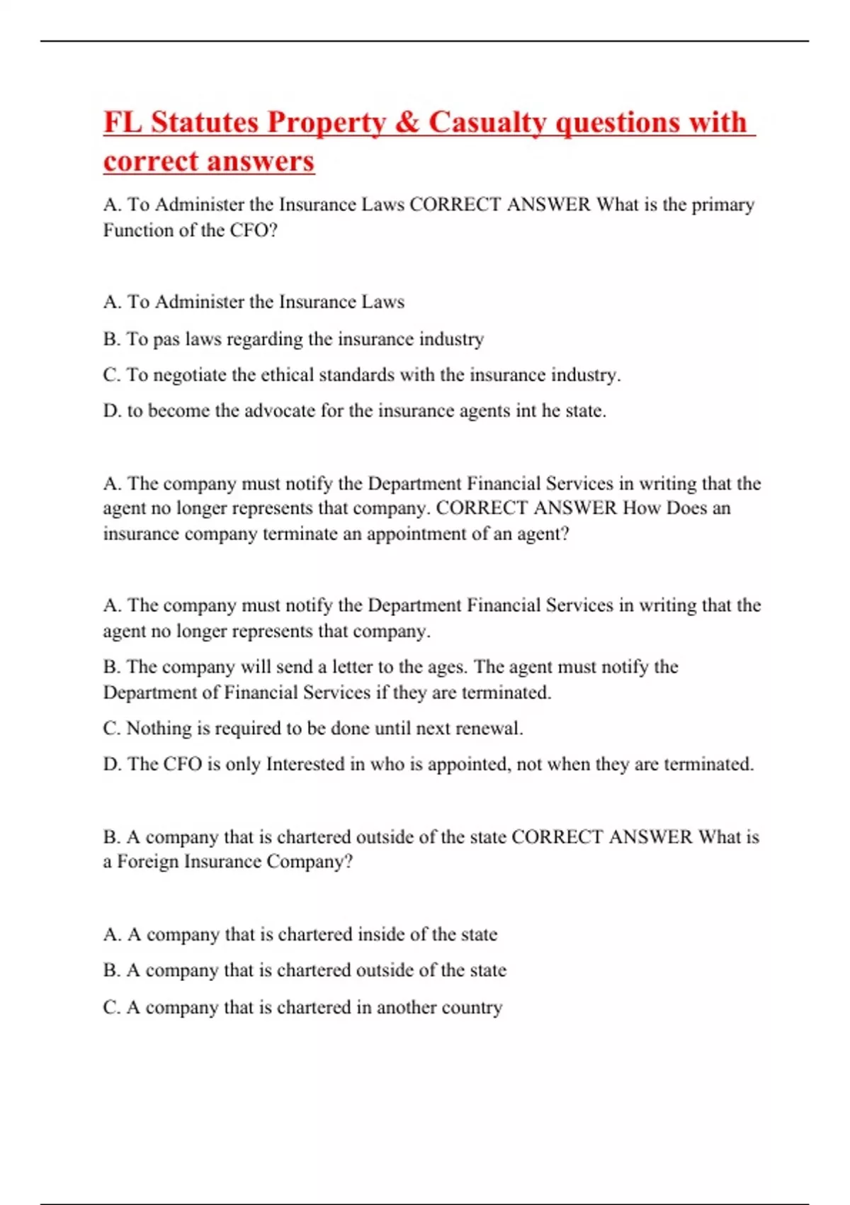 A. To Administer the Insurance Laws CORRECT ANSWER What is the primary Function of the CFO? A. To Administer the Insurance Laws B. To pas laws regarding the insurance industry C. To negotiate the ethical standards with the insurance industry. D. to become the advocate for the insurance agents int he state. A. The company must notify the Department Financial Services in writing that the agent no longer represents that company. CORRECT ANSWER How Does an insurance company terminate an appointment of an agent? A. The company must notify the Department Financial Services in writing that the agent no longer represents that company. B. The company will send a letter to the ages. The agent must notify the Department of Financial Services if they are terminated. C. Nothing is required to be done until next renewal. D. The CFO is only Interested in who is appointed, not when they are terminated. B. A company that is chartered outside of the state CORRECT ANSWER What is a Foreign Insurance Company? A. A company that is chartered inside of the state B. A company that is chartered outs