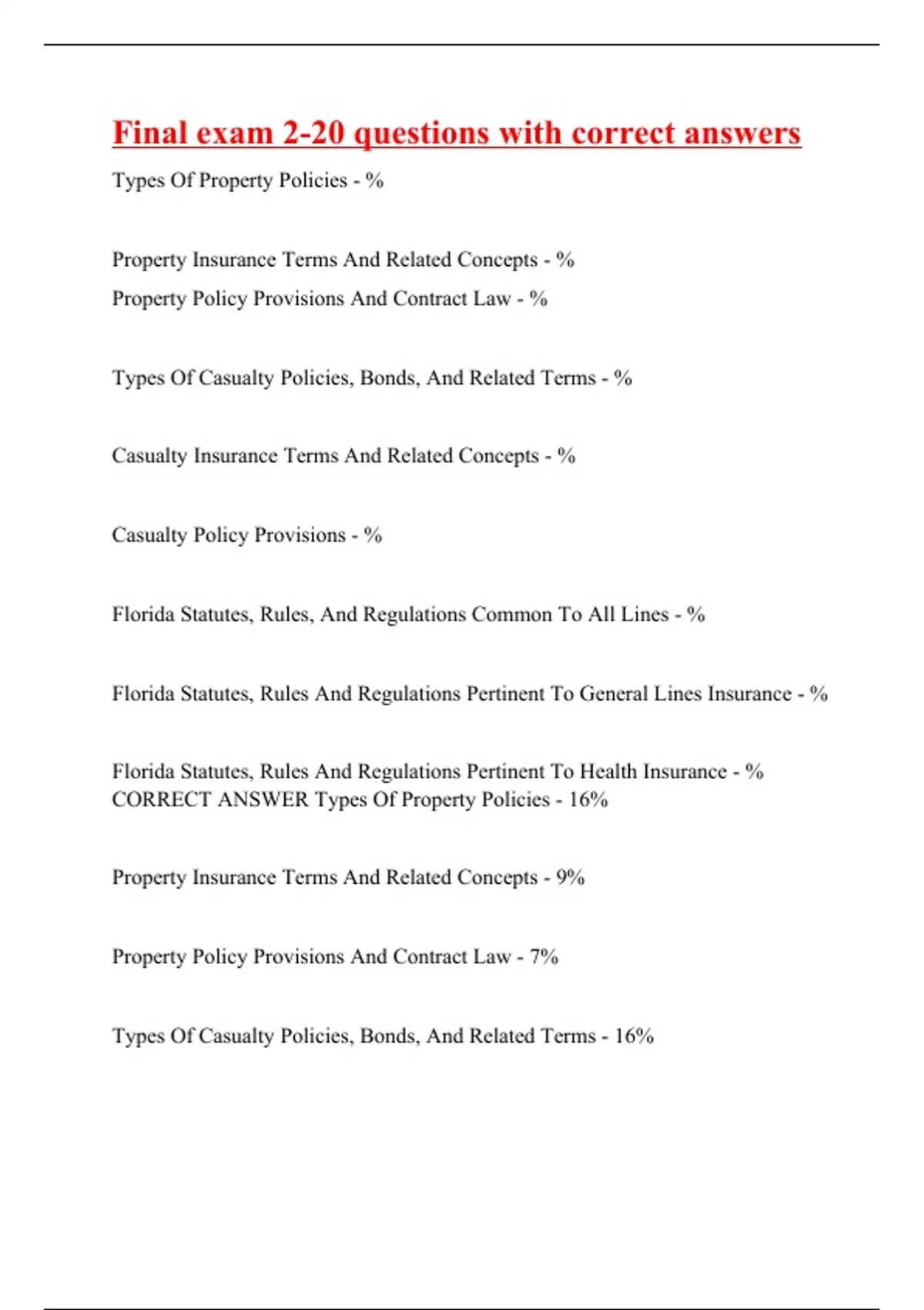Types Of Property Policies - % Property Insurance Terms And Related Concepts - % Property Policy Provisions And Contract Law - % Types Of Casualty Policies, Bonds, And Related Terms - % Casualty Insurance Terms And Related Concepts - % Casualty Policy Provisions - % Florida Statutes, Rules, And Regulations Common To All Lines - % Florida Statutes, Rules And Regulations Pertinent To General Lines Insurance - % Florida Statutes, Rules And Regulations Pertinent To Health Insurance - % CORRECT ANSWER Types Of Property Policies - 16% Property Insurance Terms And Related Concepts - 9%