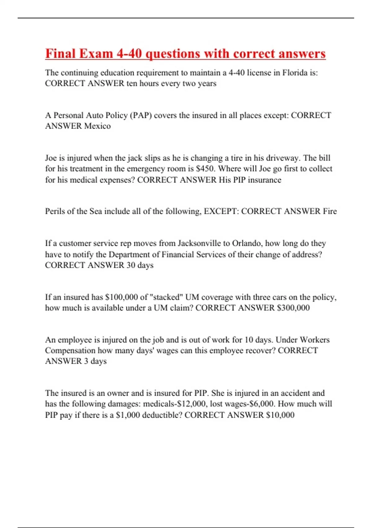 The continuing education requirement to maintain a 4-40 license in Florida is: CORRECT ANSWER ten hours every two years A Personal Auto Policy (PAP) covers the insured in all places except: CORRECT ANSWER Mexico Joe is injured when the jack slips as he is changing a tire in his driveway. The bill for his treatment in the emergency room is $450. Where will Joe go first to collect for his medical expenses? CORRECT ANSWER His PIP insurance Perils of the Sea include all of the following, EXCEPT: CORRECT ANSWER Fire If a customer service rep moves from Jacksonville to Orlando, how long do they have to notify the Department of Financial Services of their change of address? CORRECT ANSWER 30 days If an insured has $100,000 of "stacked" UM coverage with three cars on the policy, how much is available under a UM claim? CORRECT ANSWER $300,000 An employee is injured on the job and is out of work for 10 days. Under Workers Compensation how many days' wages can this employee recover? CORRECT ANSWER 3 days The insured is an owner and is insured for PIP. She is injured in an accident and has the following damages: medicals-$12,000, lost wages-$6,000. How much will PIP pay if there is a $1,000 deductible?