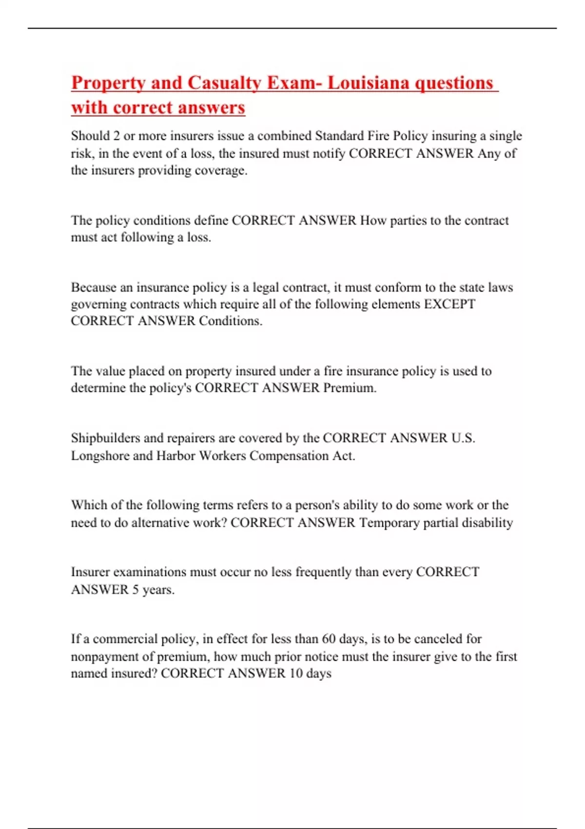 Should 2 or more insurers issue a combined Standard Fire Policy insuring a single risk, in the event of a loss, the insured must notify CORRECT ANSWER Any of the insurers providing coverage. The policy conditions define CORRECT ANSWER How parties to the contract must act following a loss. Because an insurance policy is a legal contract, it must conform to the state laws governing contracts which require all of the following elements EXCEPT CORRECT ANSWER Conditions. The value placed on property insured under a fire insurance policy is used to determine the policy's CORRECT ANSWER Premium. Shipbuilders and repairers are covered by the CORRECT ANSWER U.S. Longshore and Harbor Workers Compensation Act. Which of the following terms refers to a person's ability to do some work or the need to do alternative work? CORRECT ANSWER Temporary partial disability Insurer examinations must occur no less frequently than every CORRECT ANSWER 5 years. If a commercial policy, in effect for less than 60 days, is to be canceled for nonpayment of premium, how much prior notice must the insurer give to the first named insured? CORRECT ANSWER 10 days The Residential Condominium Building Association Policy (RCBAP) is used for residential condominium building associations to cov