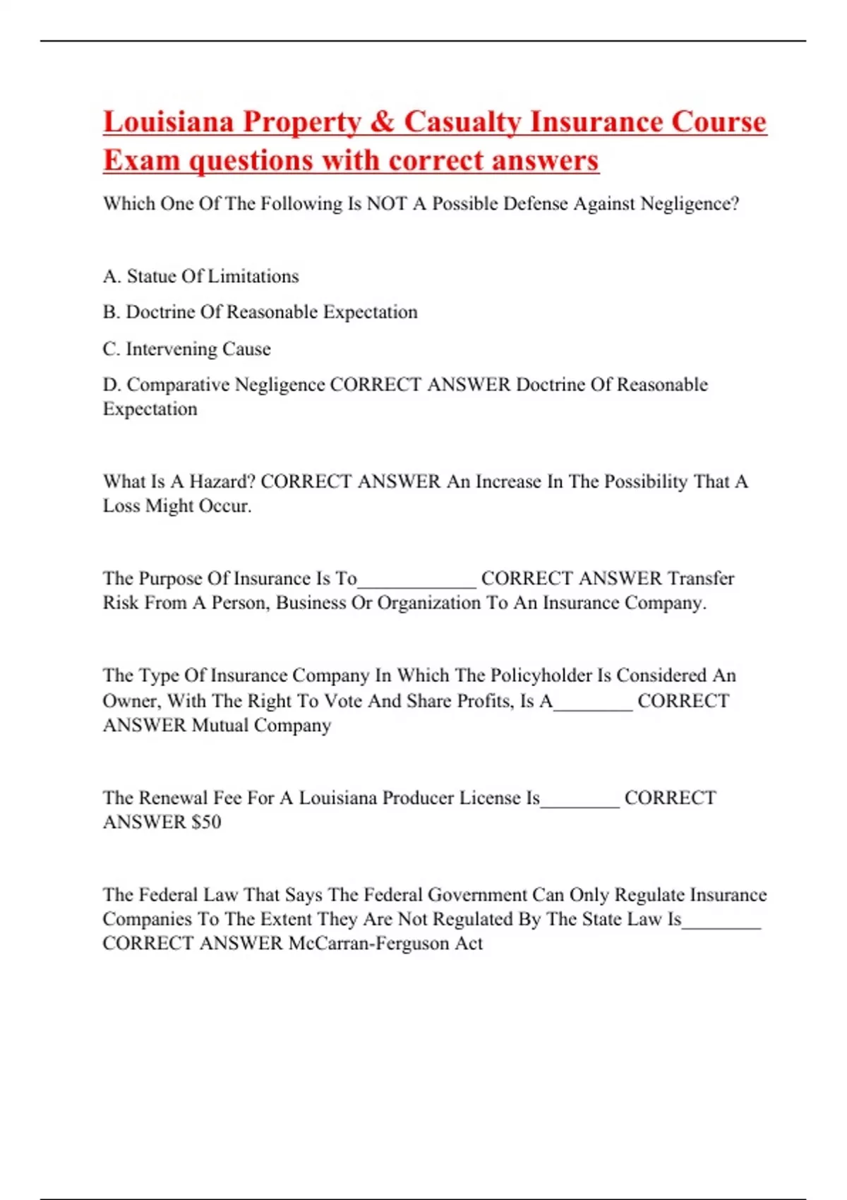 Which One Of The Following Is NOT A Possible Defense Against Negligence? A. Statue Of Limitations B. Doctrine Of Reasonable Expectation C. Intervening Cause D. Comparative Negligence CORRECT ANSWER Doctrine Of Reasonable Expectation What Is A Hazard? CORRECT ANSWER An Increase In The Possibility That A Loss Might Occur. The Purpose Of Insurance Is To____________ CORRECT ANSWER Transfer Risk From A Person, Business Or Organization To An Insurance Company. The Type Of Insurance Company In Which The Policyholder Is Considered An Owner, With The Right To Vote And Share Profits, Is A________ CORRECT ANSWER Mutual Company The Renewal Fee For A Louisiana Producer License Is________ CORRECT ANSWER $50 The Federal Law That Says The Federal Government Can Only Regulate Insurance Companies To The Extent They Are Not Regulated By The State Law Is________ CORRECT ANSWER McCarran-Ferguson Act An Insurance Policy Is Prepared By T