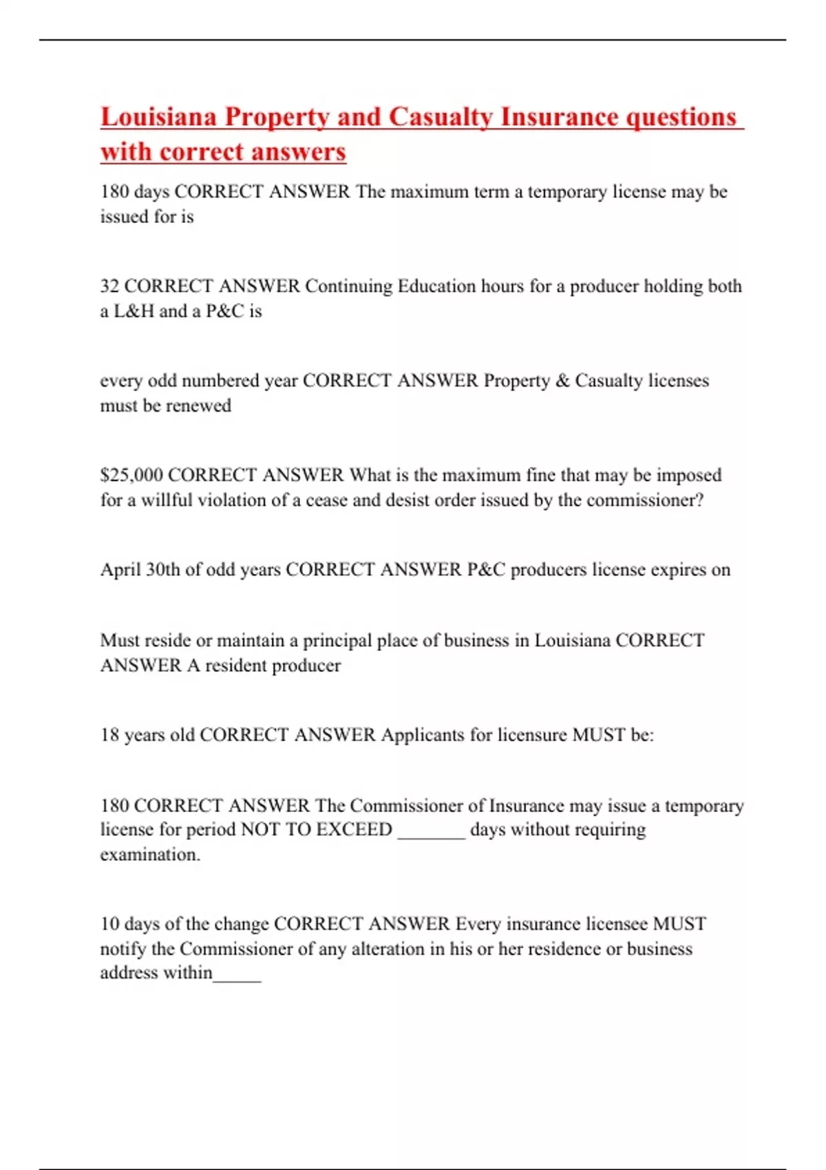 180 days CORRECT ANSWER The maximum term a temporary license may be issued for is 32 CORRECT ANSWER Continuing Education hours for a producer holding both a L&H and a P&C is every odd numbered year CORRECT ANSWER Property & Casualty licenses must be renewed $25,000 CORRECT ANSWER What is the maximum fine that may be imposed for a willful violation of a cease and desist order issued by the commissioner? April 30th of odd years CORRECT ANSWER P&C producers license expires on Must reside or maintain a principal place of business in Louisiana CORRECT ANSWER A resident producer 18 years old CORRECT ANSWER Applicants for licensure MUST be: 180 CORRECT ANSWER The Commissioner of Insurance may issue a temporary license for period NOT TO EXCEED _______ days without requiring examination. 10 days of the change CORRECT ANSWER Every insurance licensee MUST notify the Commissioner of any alteration in his or her residence or business address within_____