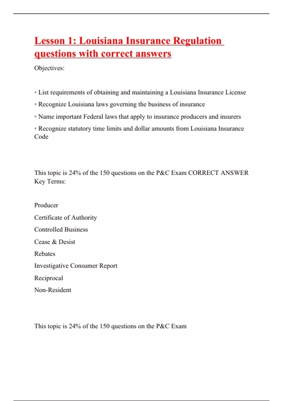 Objectives: ◦ List requirements of obtaining and maintaining a Louisiana Insurance License ◦ Recognize Louisiana laws governing the business of insurance ◦ Name important Federal laws that apply to insurance producers and insurers ◦ Recognize statutory time limits and dollar amounts from Louisiana Insurance Code This topic is 24% of the 150 questions on the P&C Exam CORRECT ANSWER Key Terms: Producer Certificate of Authority Controlled Business Cease & Desist Rebates Investigative Consumer Report Reciprocal Non-Resident This topic is 24% of the 150 questions