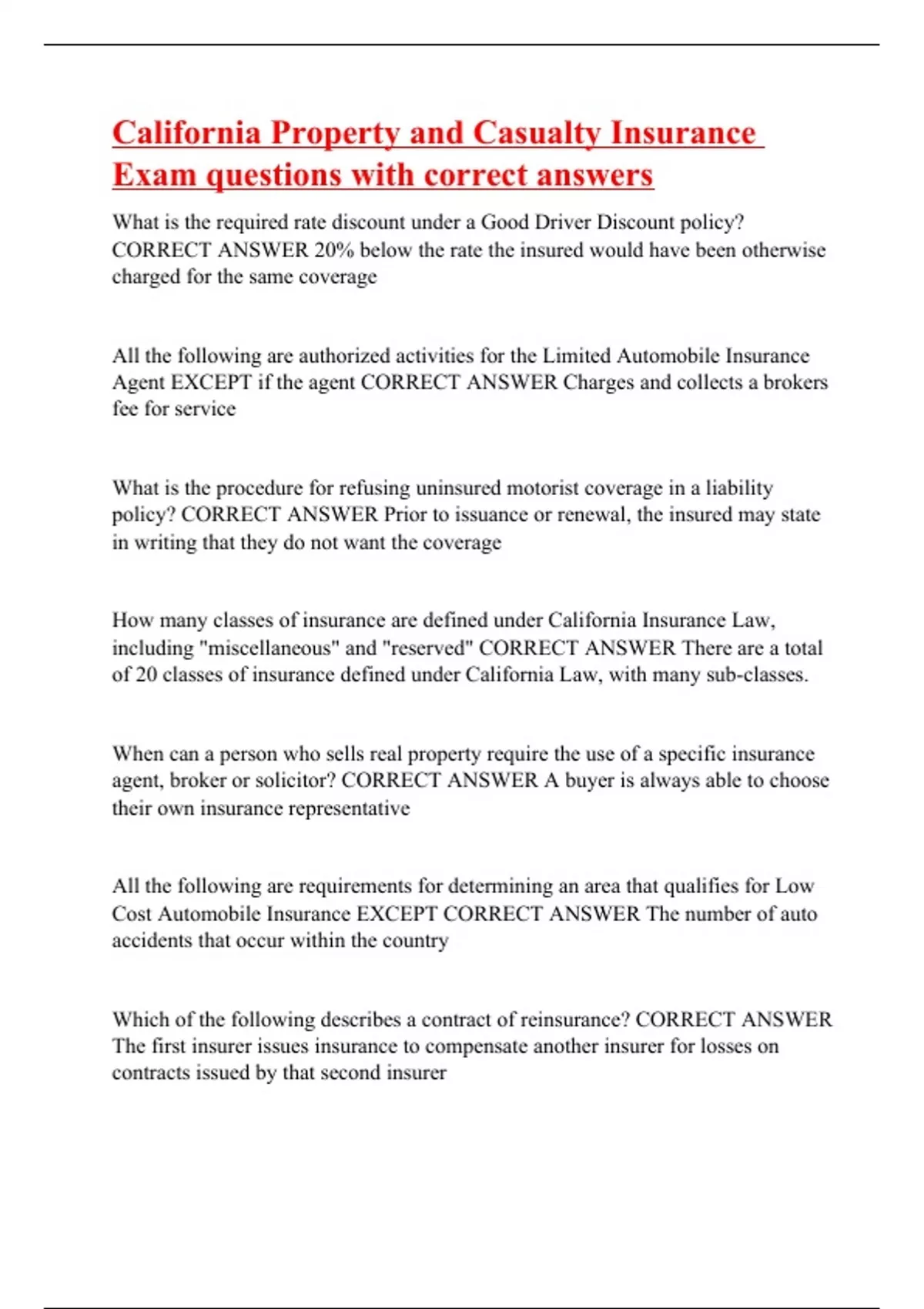 What is the required rate discount under a Good Driver Discount policy? CORRECT ANSWER 20% below the rate the insured would have been otherwise charged for the same coverage All the following are authorized activities for the Limited Automobile Insurance Agent EXCEPT if the agent CORRECT ANSWER Charges and collects a brokers fee for service What is the procedure for refusing uninsured motorist coverage in a liability policy? CORRECT ANSWER Prior to issuance or renewal, the insured may state in writing that they do not want the coverage How many classes of insurance are defined under California Insurance Law, including "miscellaneous" and "reserved" CORRECT ANSWER There are a total of 20 classes of insurance defined under California Law, with many sub-classes. When can a person who sells real property require the use of a specific insurance agent, broker or solicitor? CORRECT ANSWER A buyer is always able to choose their own insurance representative All the following are requirements for determining an area that qualifies for Low Cost Automobile Insurance EXCEPT CORRECT ANSWER The number of auto accidents that occur within the country Which of the following describes a contract of reinsurance? CORRECT ANSWER The first insurer issues insurance to compensate another insurer for losses on contracts issued by that second insurer