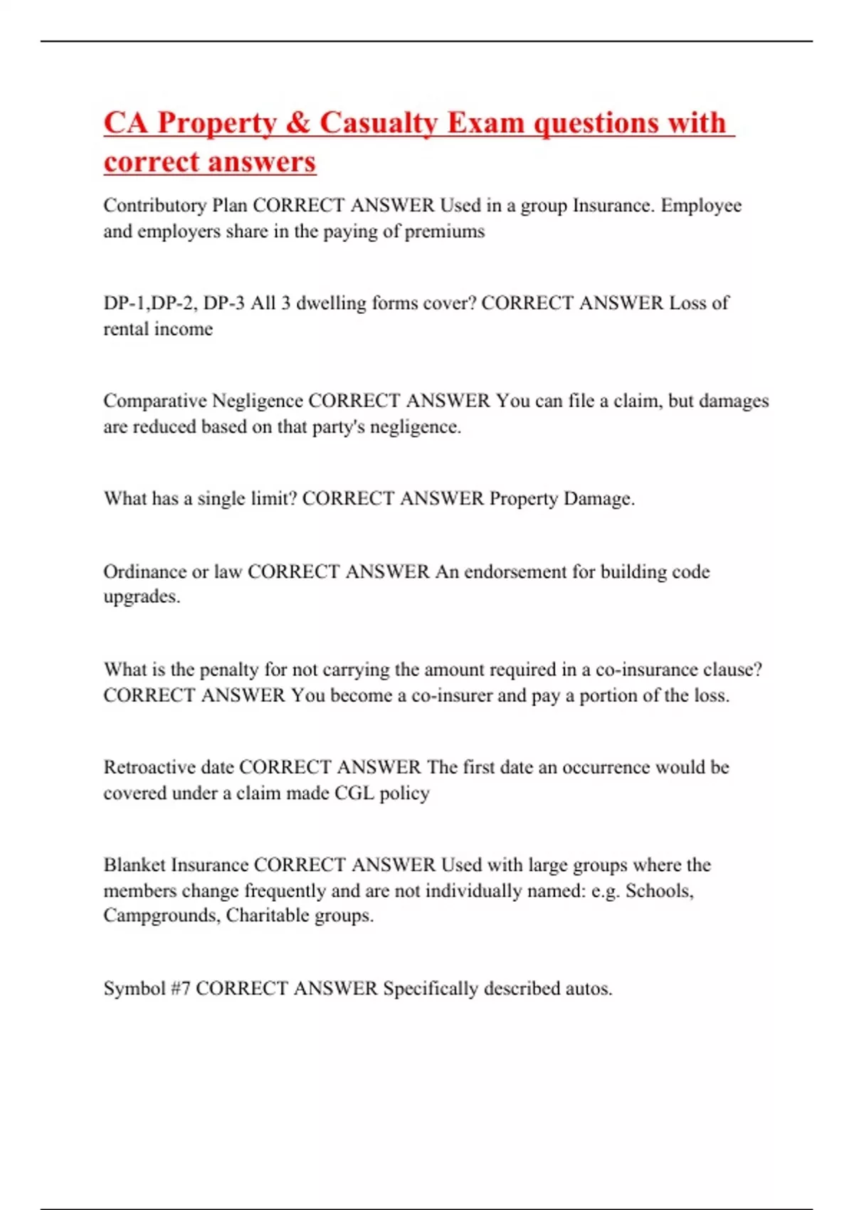 Contributory Plan CORRECT ANSWER Used in a group Insurance. Employee and employers share in the paying of premiums DP-1,DP-2, DP-3 All 3 dwelling forms cover? CORRECT ANSWER Loss of rental income Comparative Negligence CORRECT ANSWER You can file a claim, but damages are reduced based on that party's negligence. What has a single limit? CORRECT ANSWER Property Damage. Ordinance or law CORRECT ANSWER An endorsement for building code upgrades. What is the penalty for not carrying the amount required in a co-insurance clause? CORRECT ANSWER You become a co-insurer and pay a portion of the loss. Retroactive date CORRECT ANSWER The first date an occurrence would be covered under a claim made CGL policy Blanket Insurance CORRECT ANSWER Used with large groups where the members change frequently and are