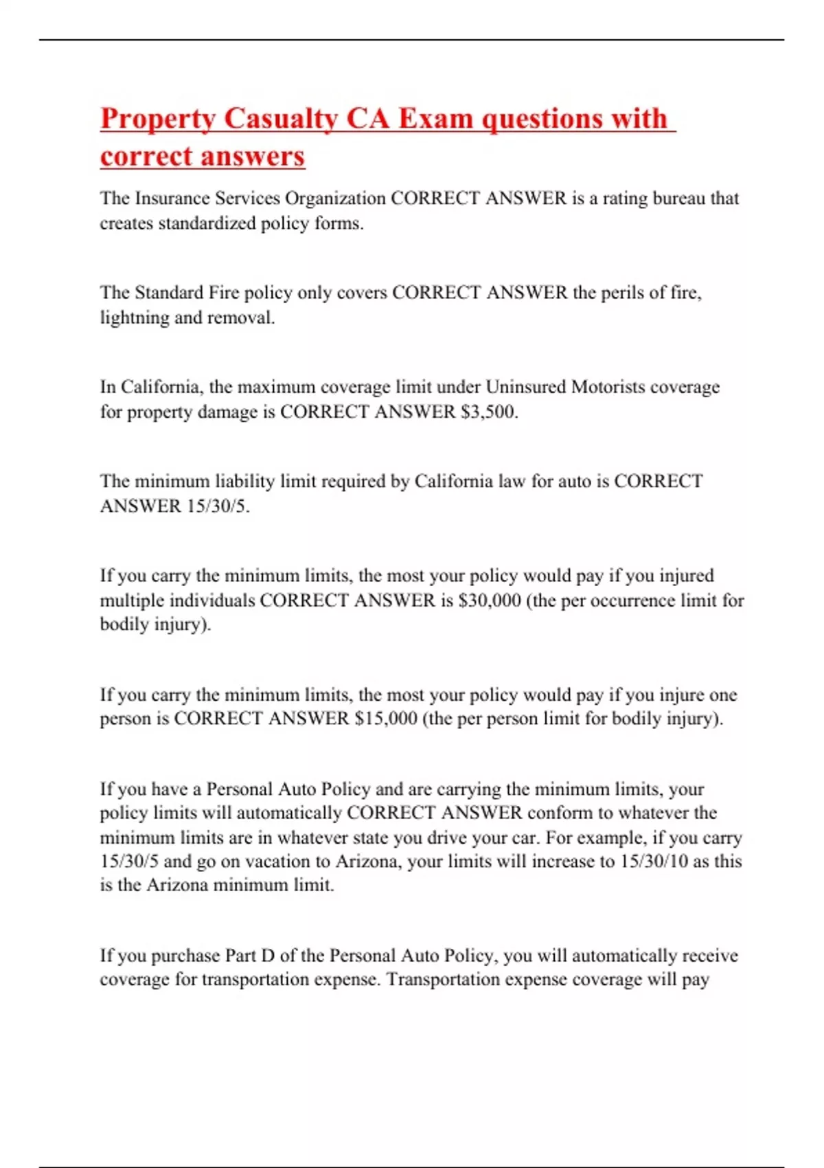 The Insurance Services Organization CORRECT ANSWER is a rating bureau that creates standardized policy forms. The Standard Fire policy only covers CORRECT ANSWER the perils of fire, lightning and removal. In California, the maximum coverage limit under Uninsured Motorists coverage for property damage is CORRECT ANSWER $3,500. The minimum liability limit required by California law for auto is CORRECT ANSWER 15/30/5. If you carry the minimum limits, the most your policy would pay if you injured multiple individuals CORRECT ANSWER is $30,000 (the per occurrence limit for bodily injury). If you carry the minimum limits, the most your policy would pay if you injure one person is CORRECT ANSWER $15,000 (the per person limit for bodily injury). If you have a Personal Auto Policy and are carrying the minimum limits, your policy limits will automatically CORRECT ANSWER conform to whatever the minimum limits are in whatever state you drive your car. For example, if you carry 15/30/5 and go on vacation to Arizona, your limits will increase to 15/30/10 as this is the Arizona minimum lim