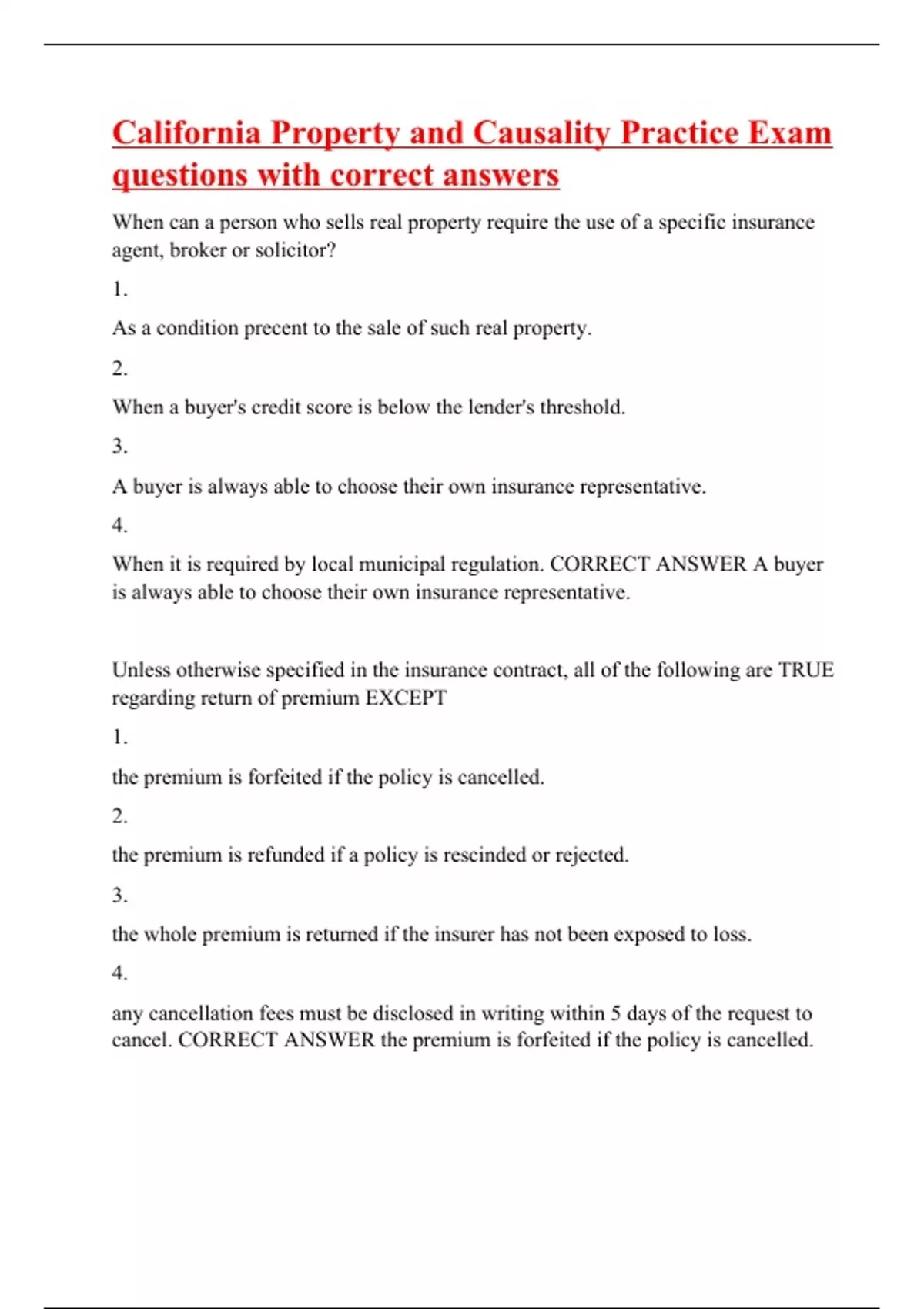When can a person who sells real property require the use of a specific insurance agent, broker or solicitor? 1. As a condition precent to the sale of such real property. 2. When a buyer's credit score is below the lender's threshold. 3. A buyer is always able to choose their own insurance representative. 4. When it is required by local municipal regulation. CORRECT ANSWER A buyer is always able to choose their own insurance representative. Unless otherwise specified in the insurance contract, all of the following are TRUE regarding return of premium EXCEPT 1. the premium is forfeited if the policy is cancelled. 2. the premium is refunded if a policy is rescinded or rejected. 3. the whole premium is returned if the insurer has not been exposed to loss. 4. any cancellation fees must be disclos
