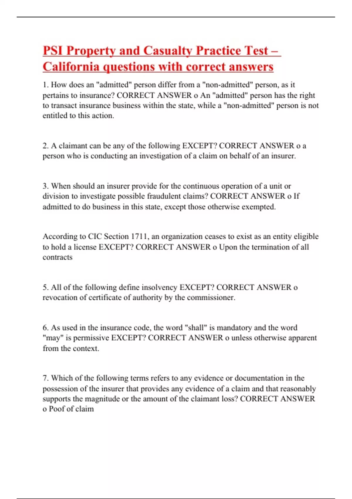 PSI Property and Casualty Practice Test – California questions with correct answers